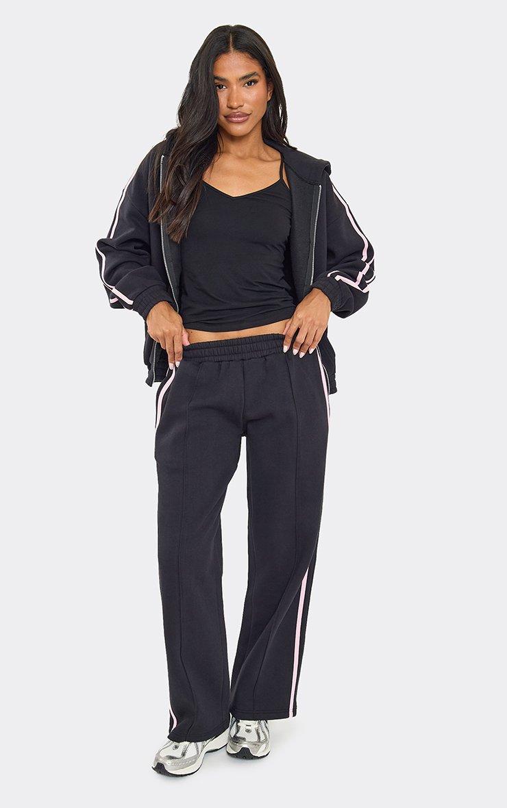Low Rise Contrast Piping Detail Wide Leg Joggers In Dark Navy Blue