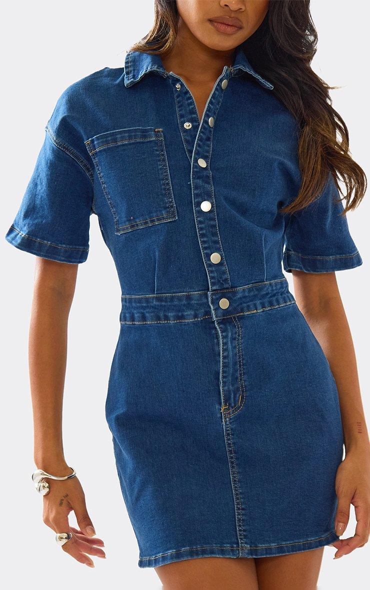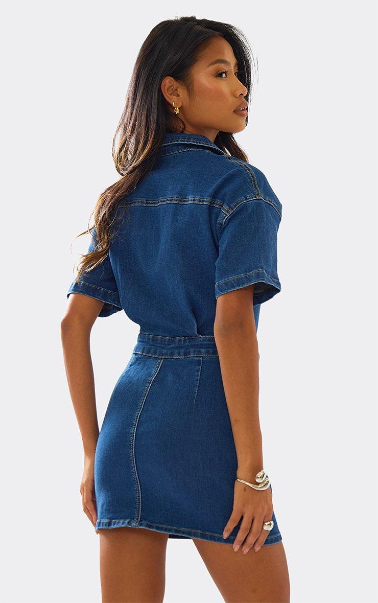 Short Sleeve Collared Button Down Front Detail Mini Dress In Mid Blue Denim