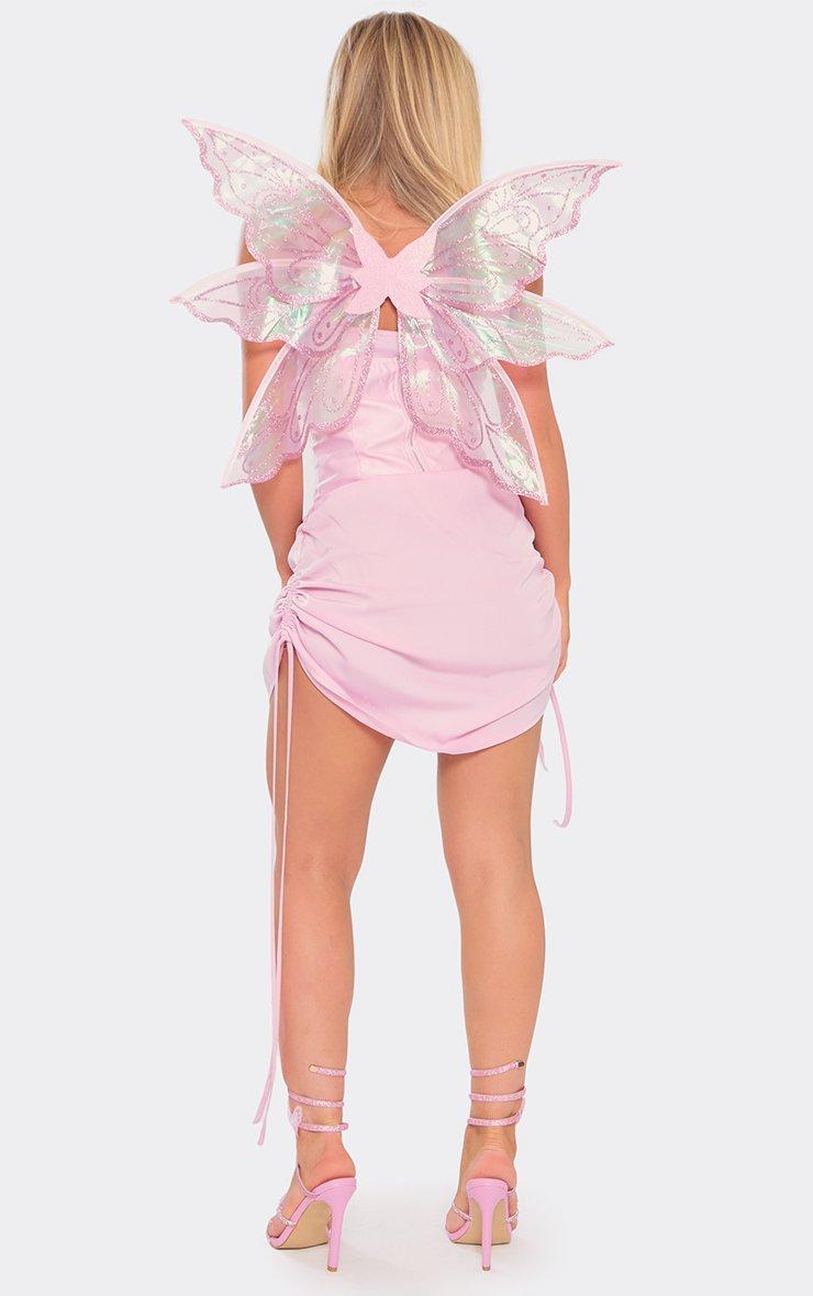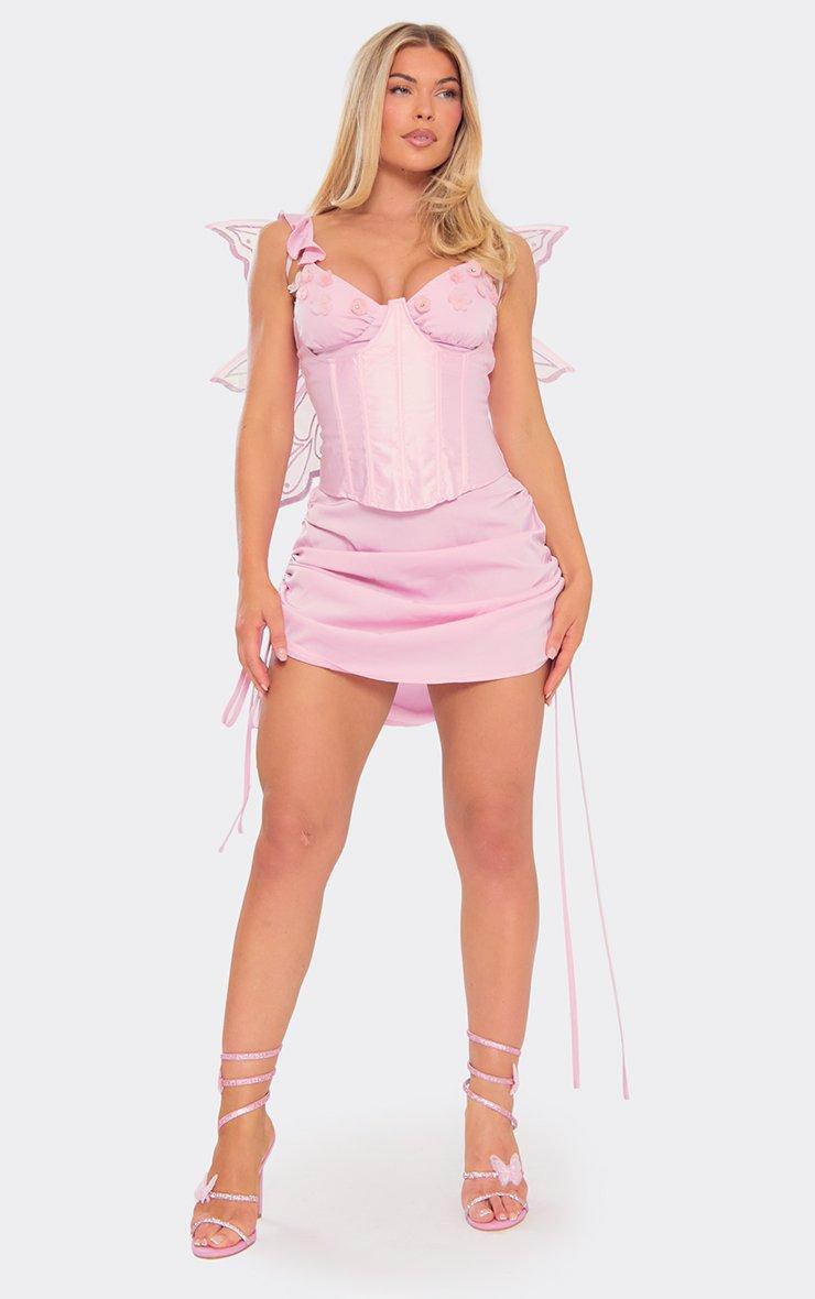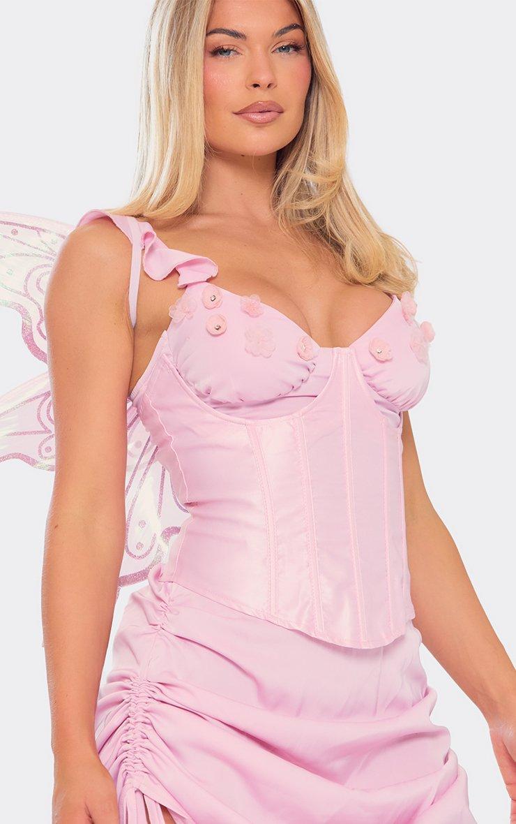 frilled strap flower applique detail ruched mini dress with corset in pink.