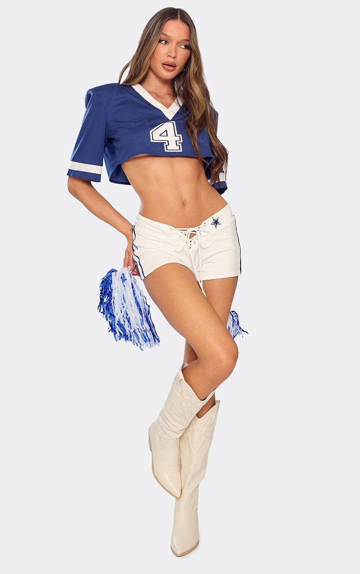 V Neck Shoulder Pad Extreme Cropped Football T-Shirt In Blue.
