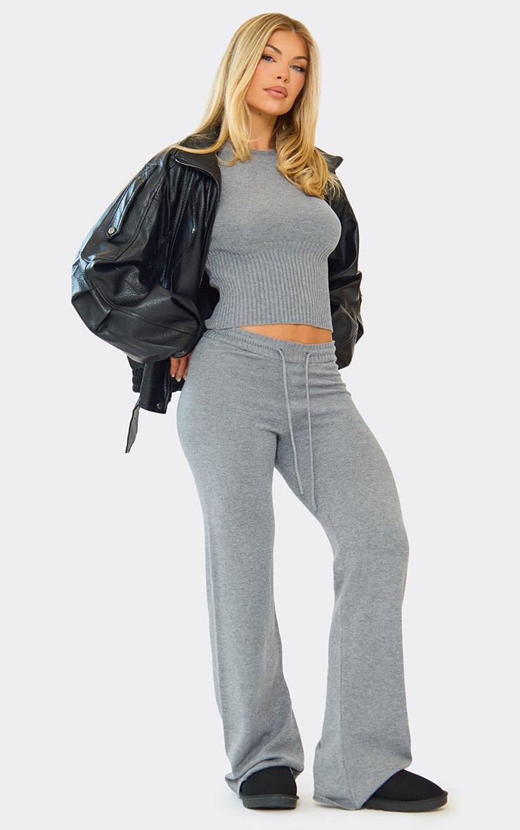 Mid Rise Fluffy Essential Logo Detail Wide Leg Trousers In Grey Knit