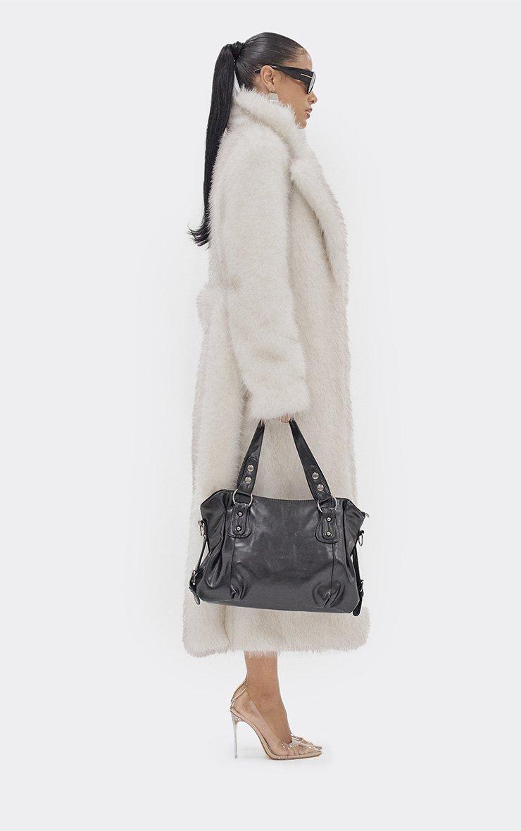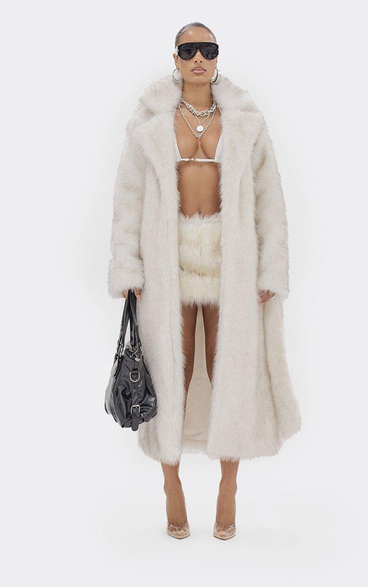 Long Sleeve Tie Waist Detail Collared Maxi Coat In White Faux Fur