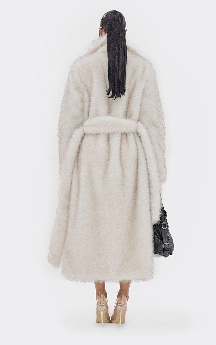 long sleeve tie waist detail collared maxi coat in white faux fur
