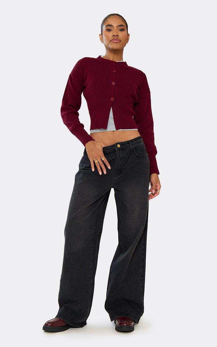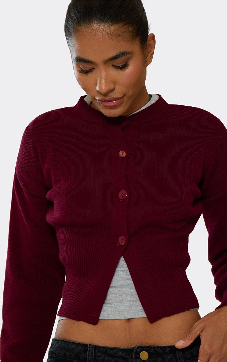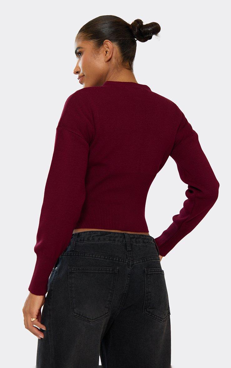 Bow Tie Front Detail Cropped Cardigan In Burgundy Knit