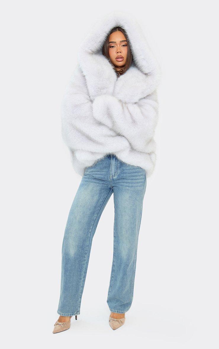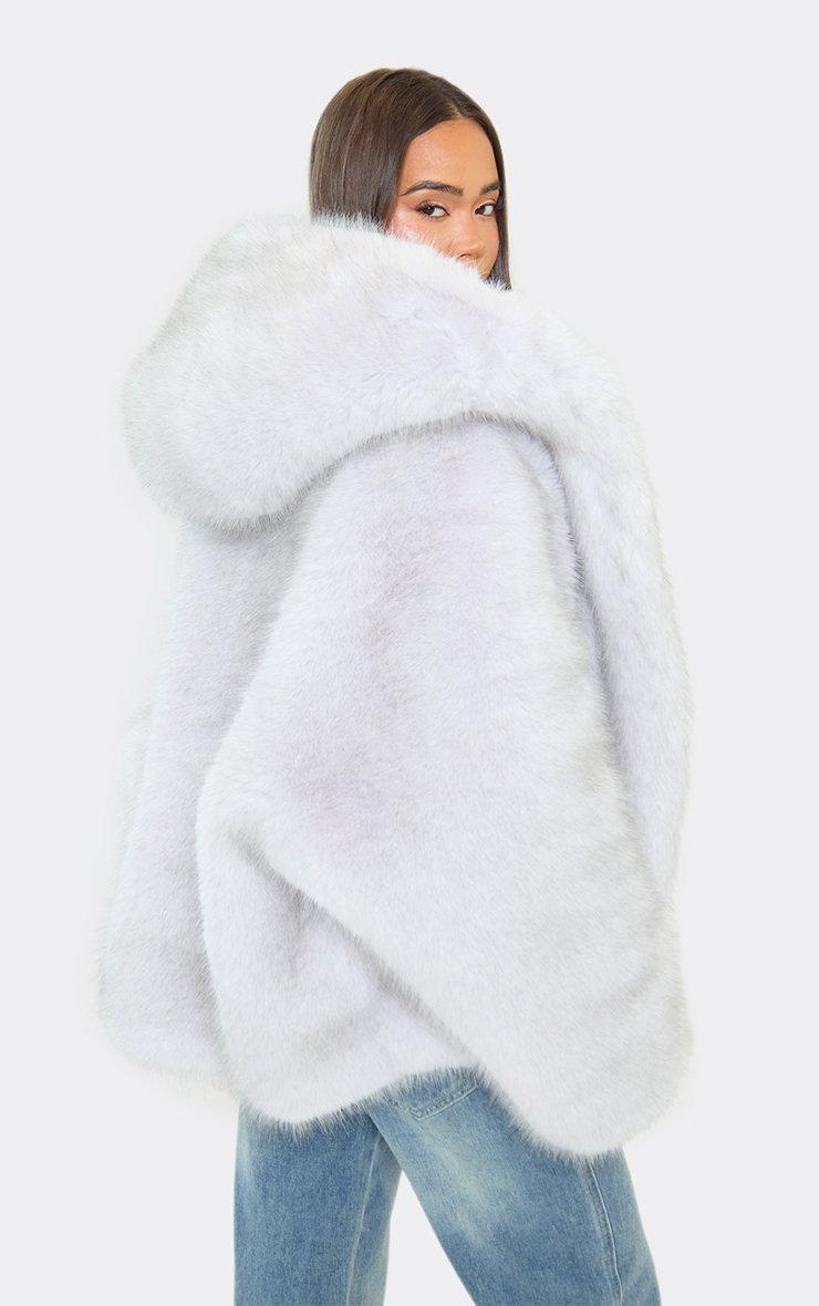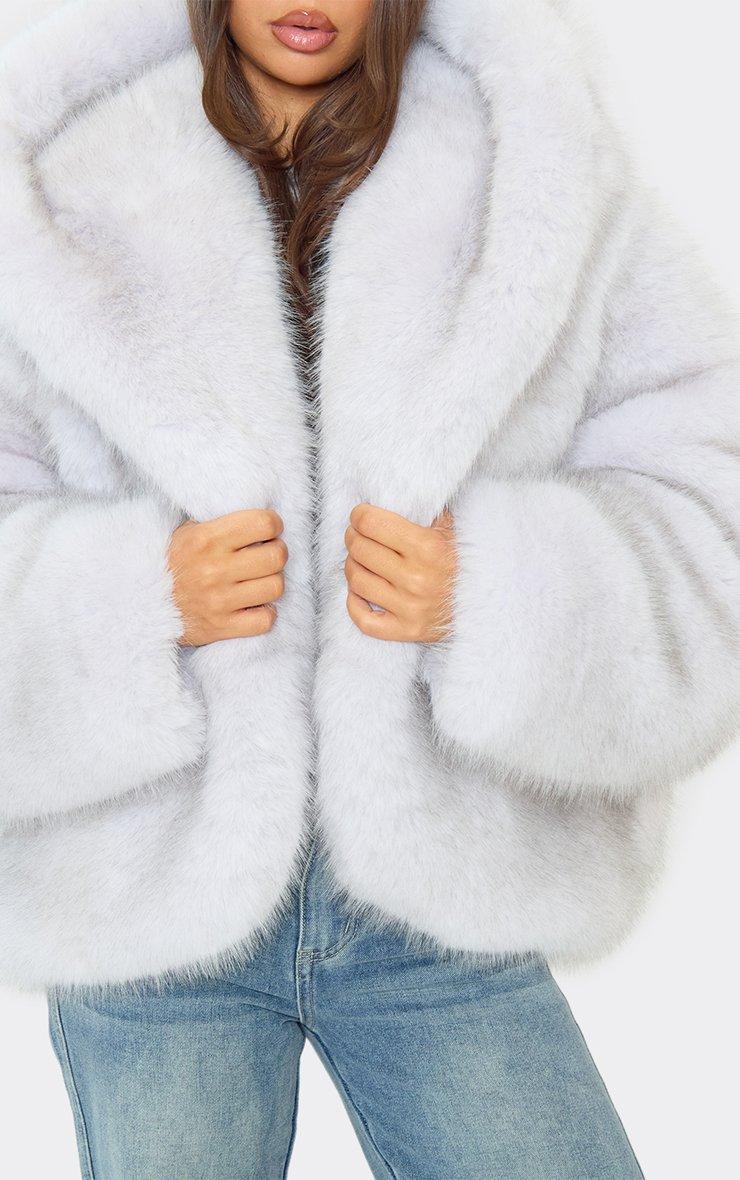 Oversized Collar Textured Detail Jacket In Grey Faux Fur