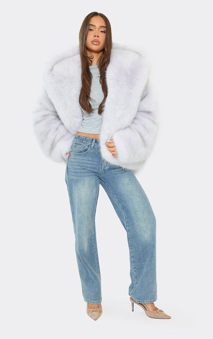 Oversized Collar Panel Detail Cropped Coat In Grey-Blue Faux Fur