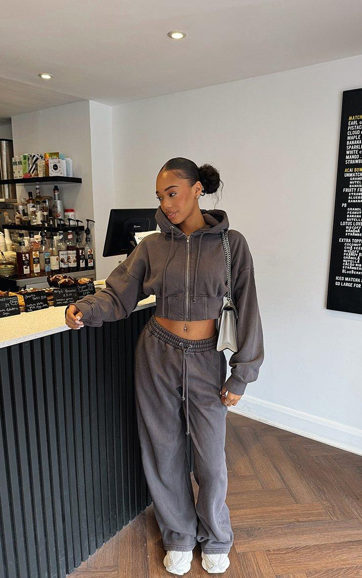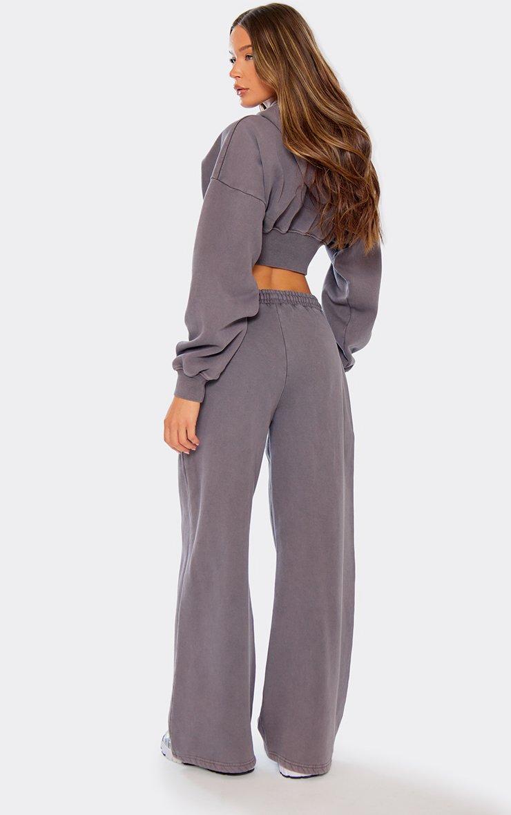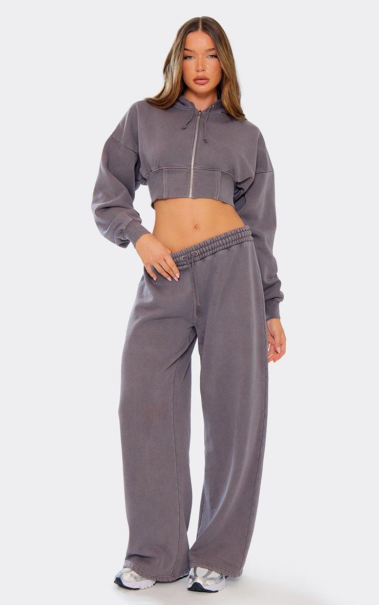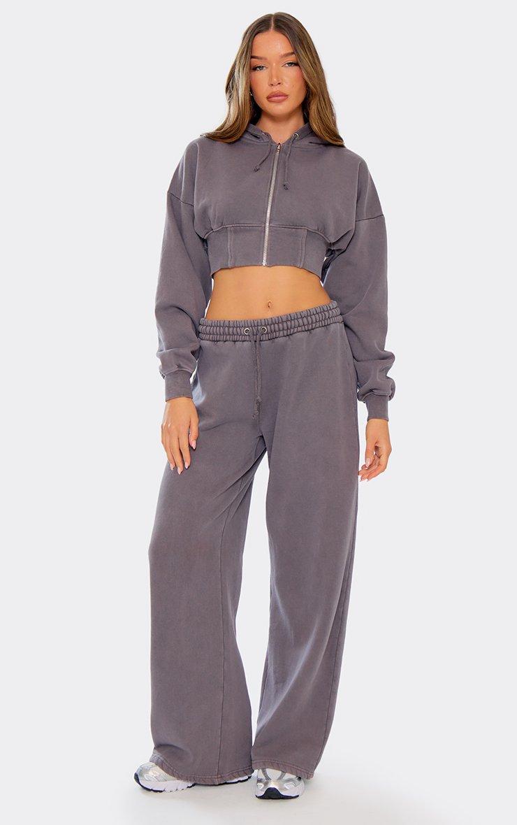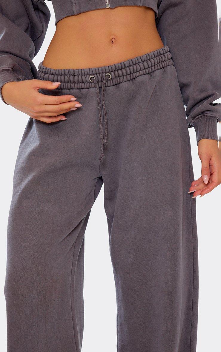 Drawstring Wide Leg Joggers In Washed Charcoal Grey
