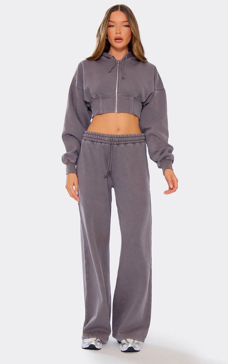long sleeve cropped cinch waist zip up hoodie in washed charcoal grey