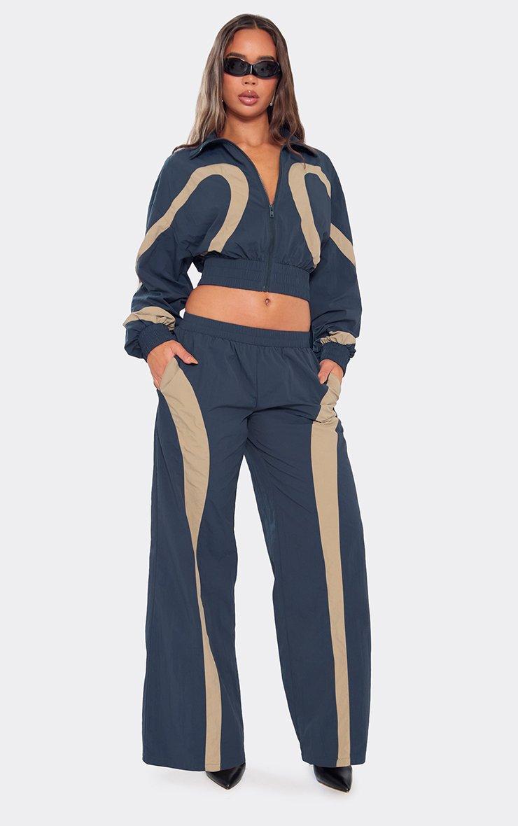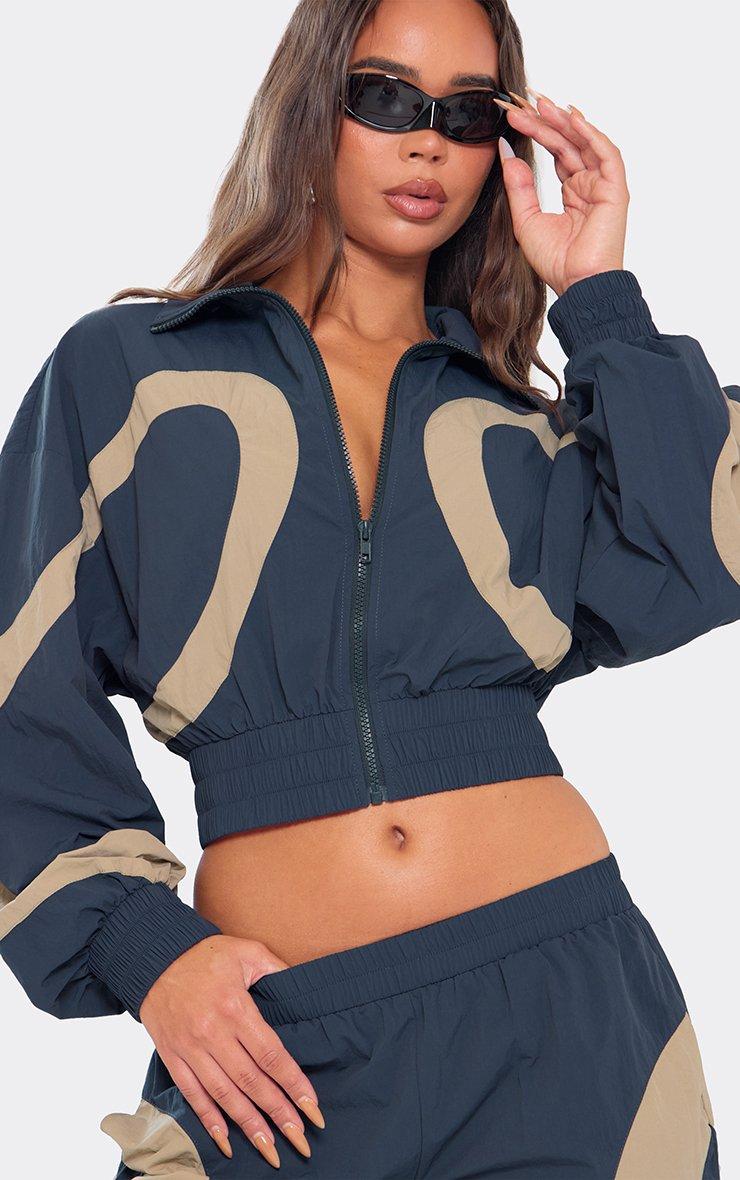 Long Sleeve Contrast Panel Toggle Hem Zip Up Jacket In Navy Shell