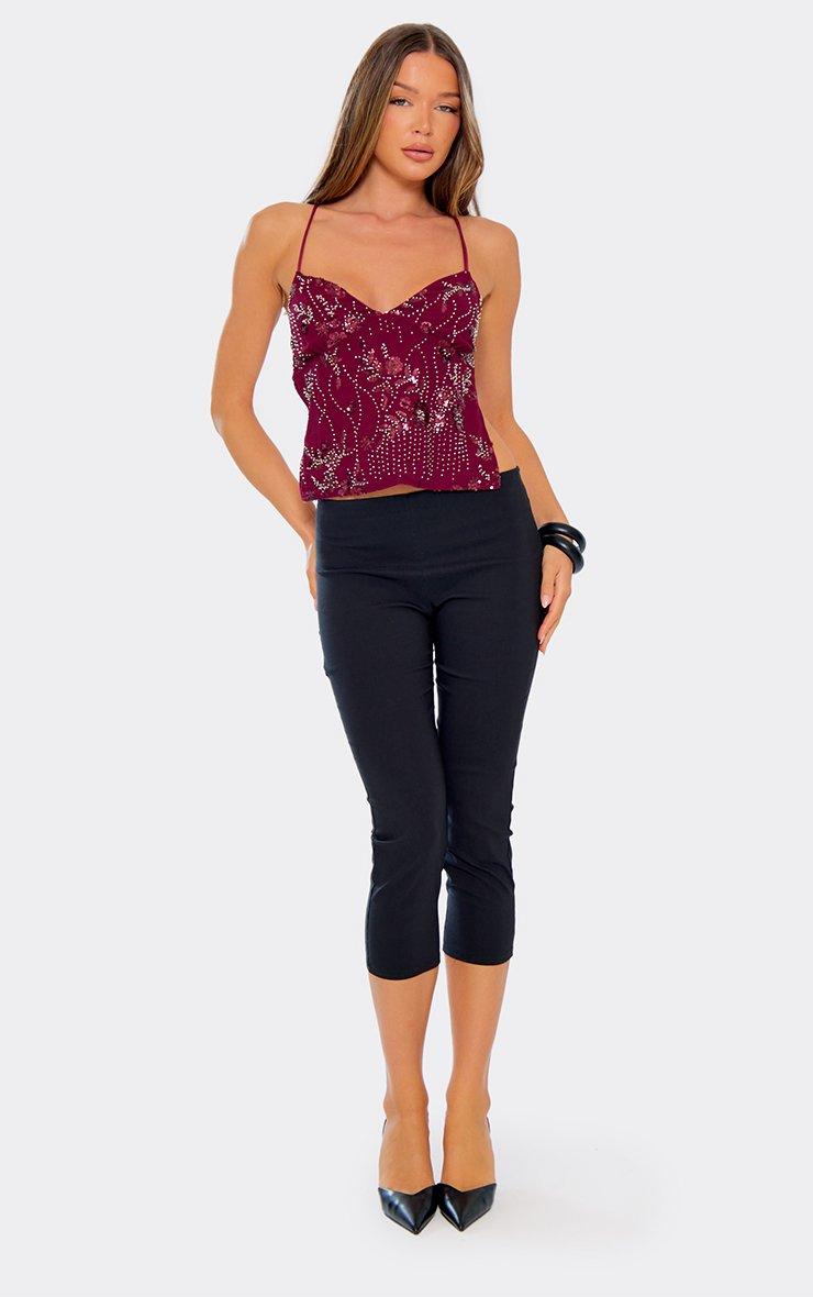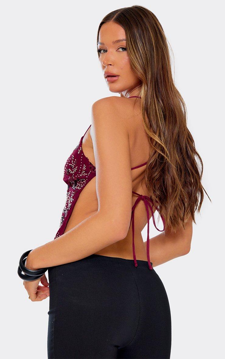 strappy tie back embellished detail cami top in plum sequin