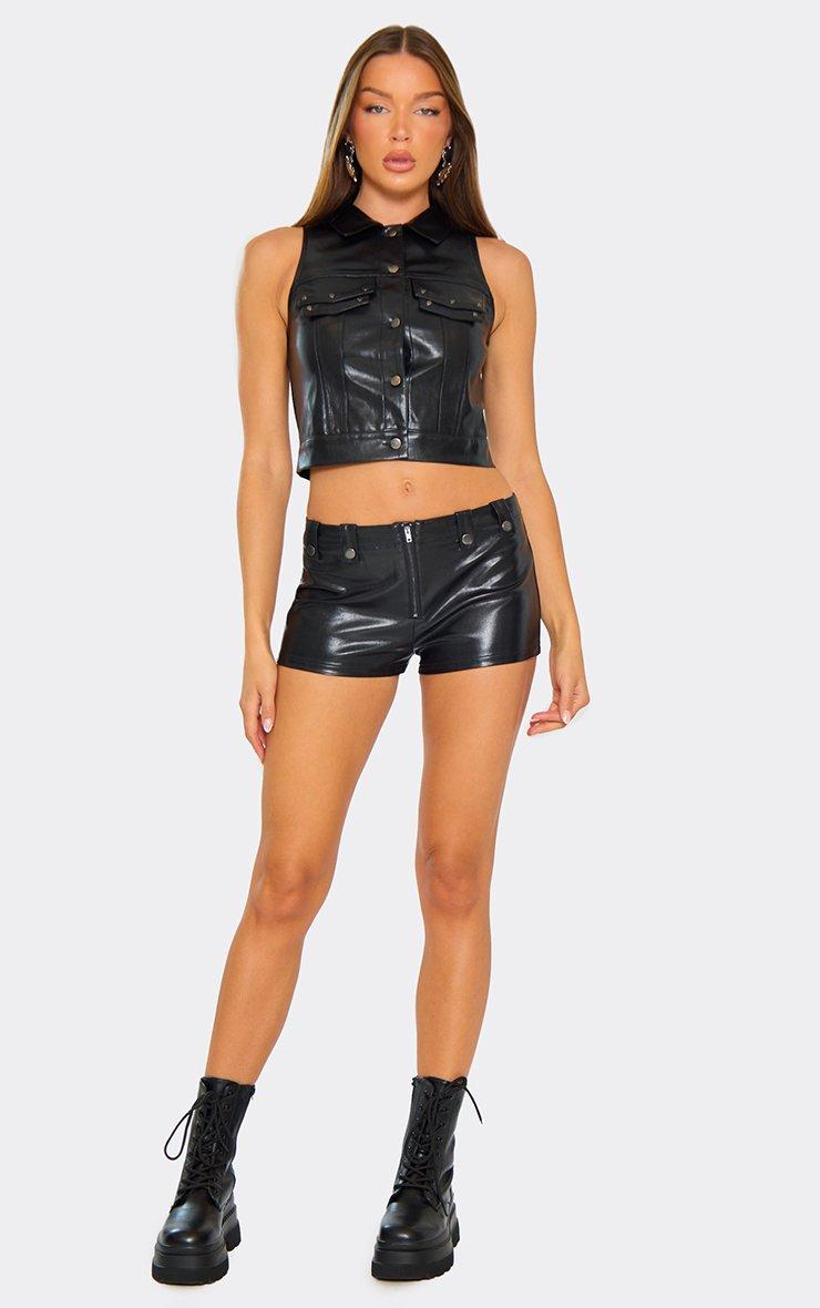 Low Rise Belt Detail Hot Pants In Black Faux Leather