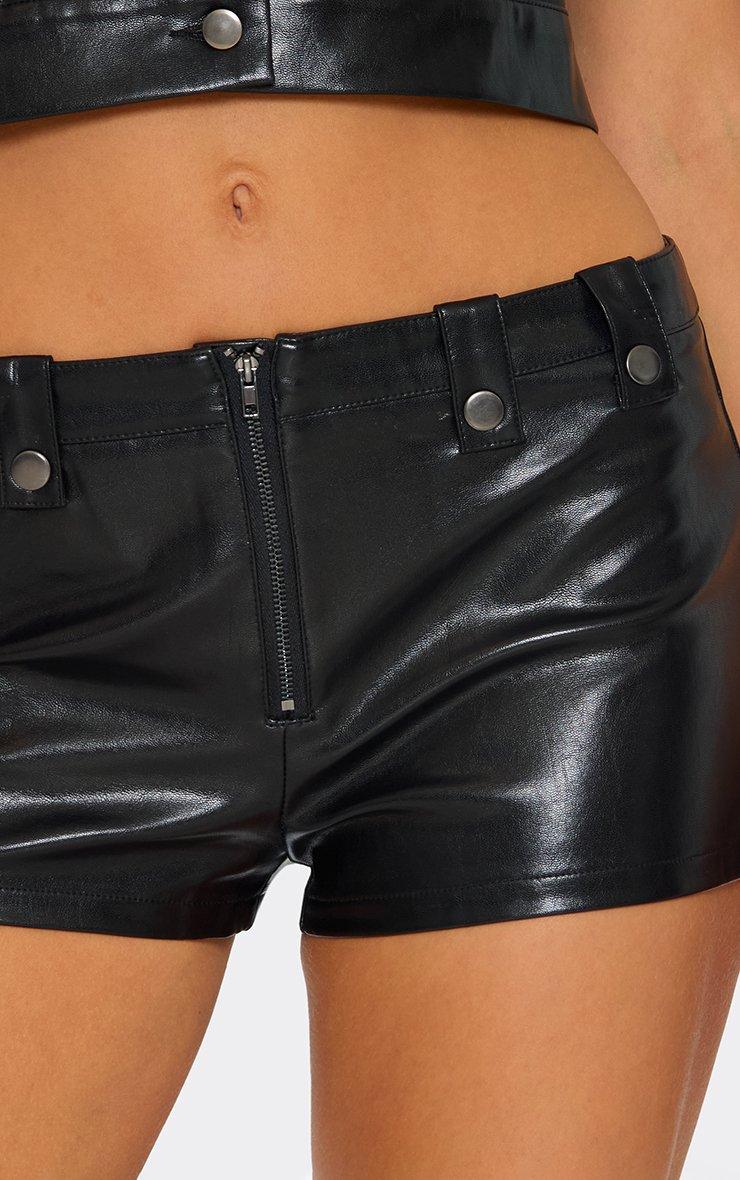 Low Rise Zip Front Hot Pants In Black Faux Leather