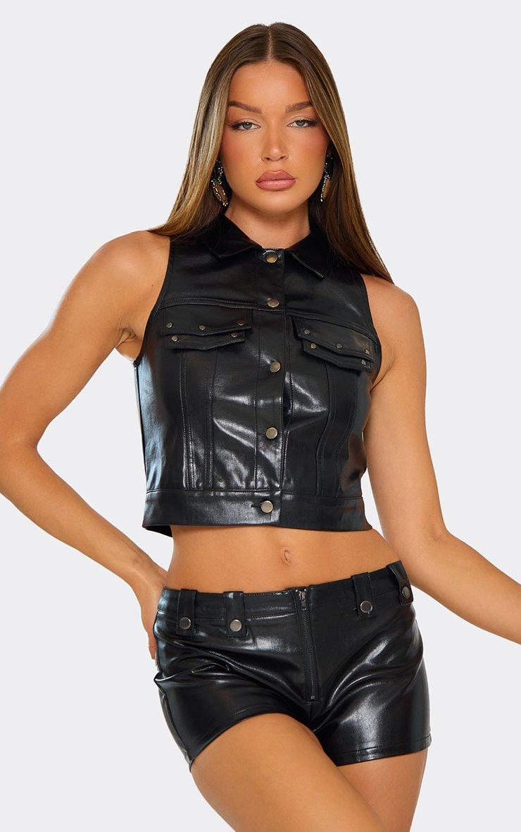 Sleeveless Stud Pocket Detail Waistcoat In Black Faux Leather