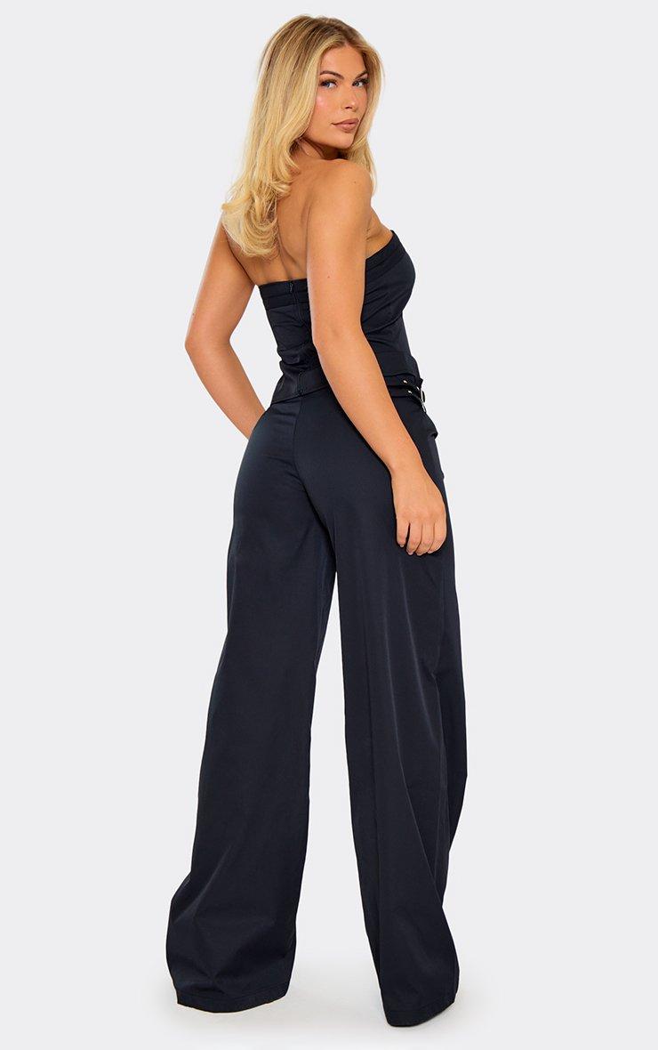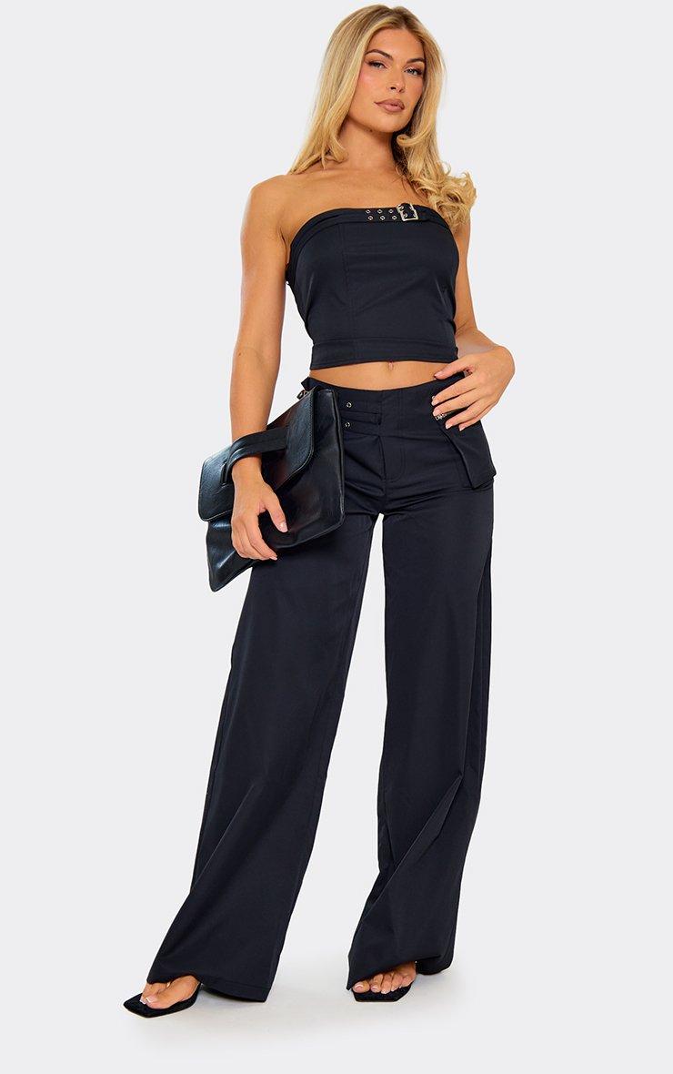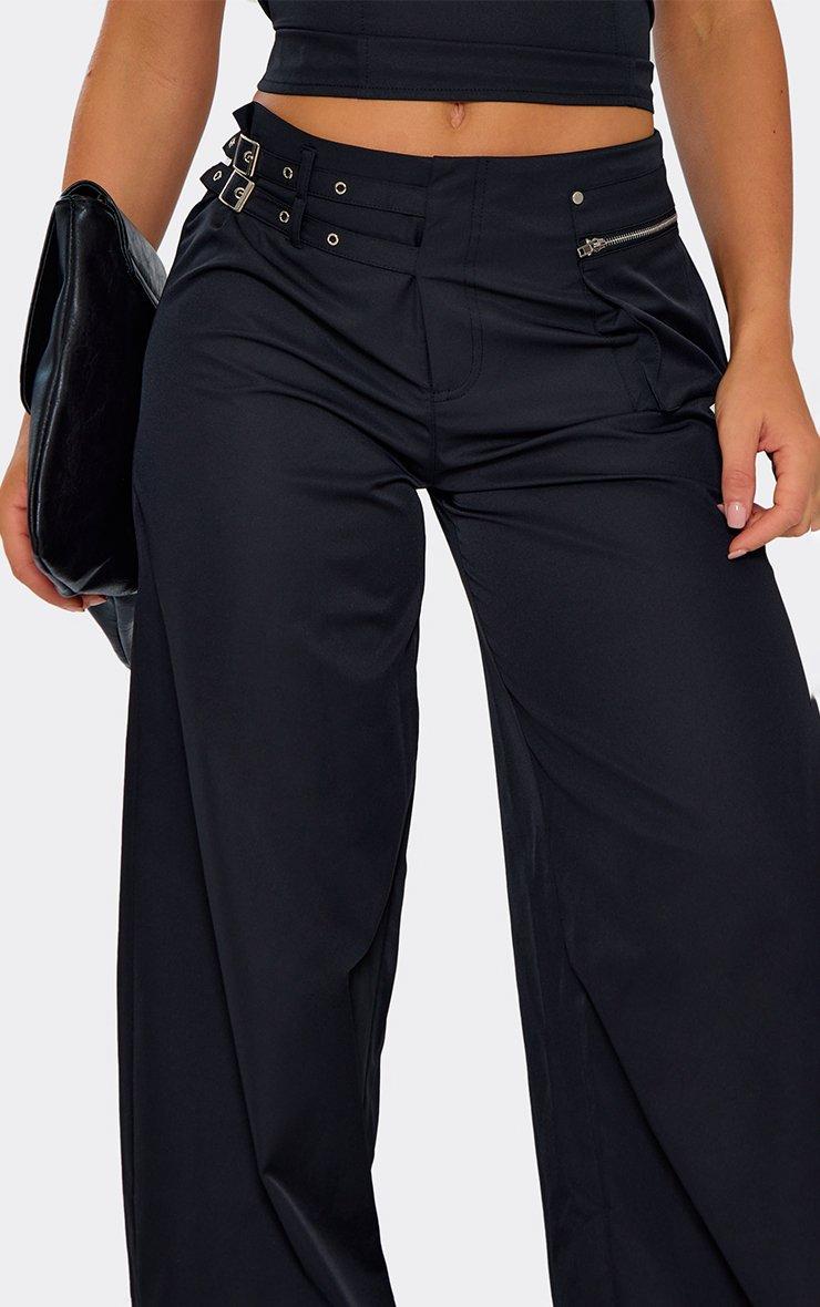 Mid Rise Belt Detail Wide Leg Trousers In Black Woven