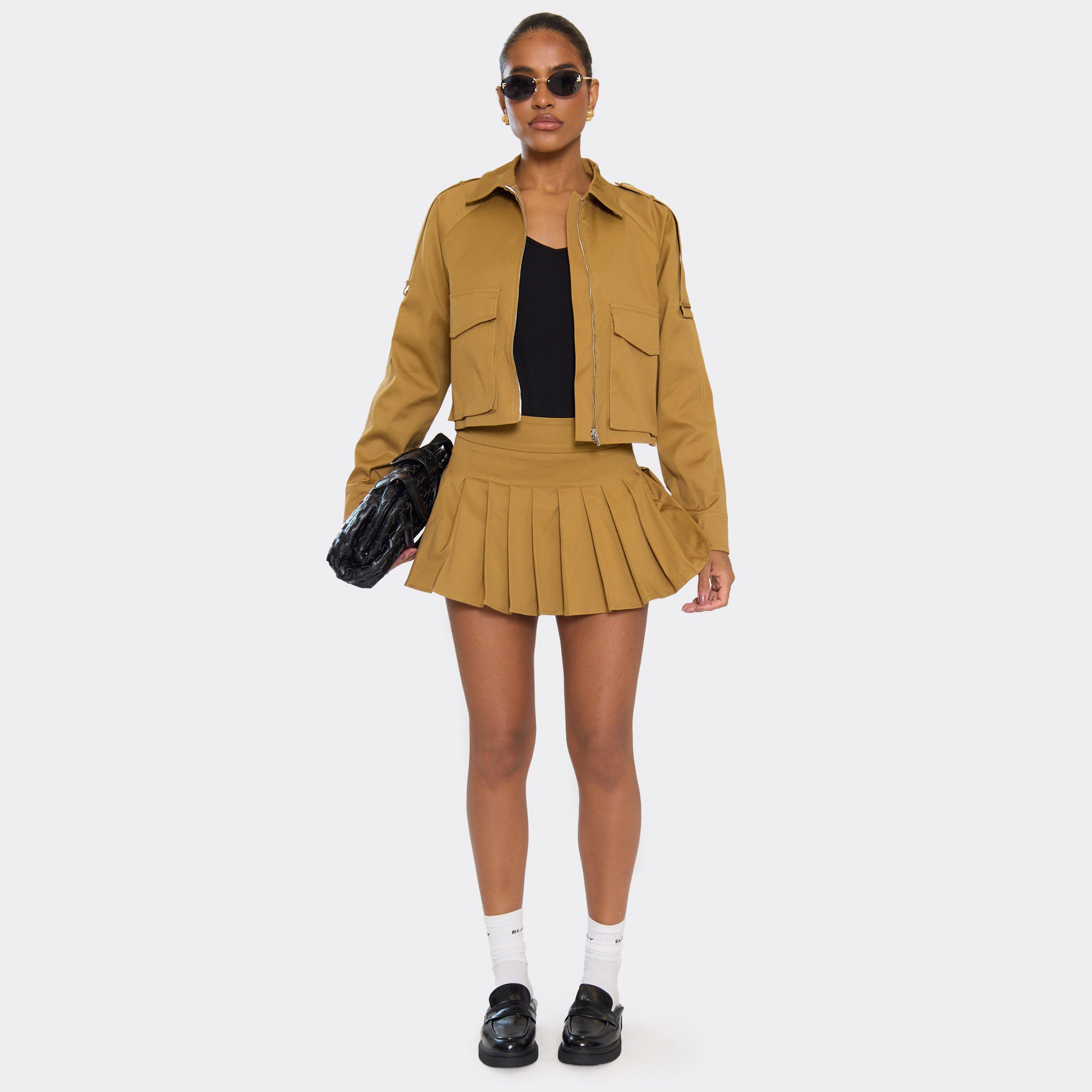 Mid Rise Pleated Hem Mini Skirt In Stone Twill