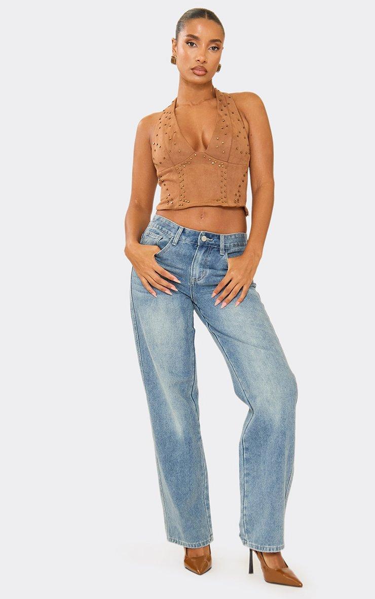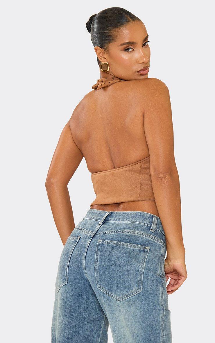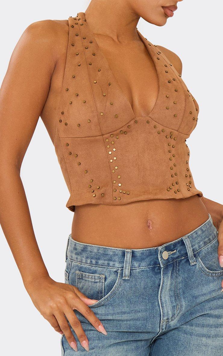 Plunge Halterneck Studded Detail Top In Brown Faux Suede