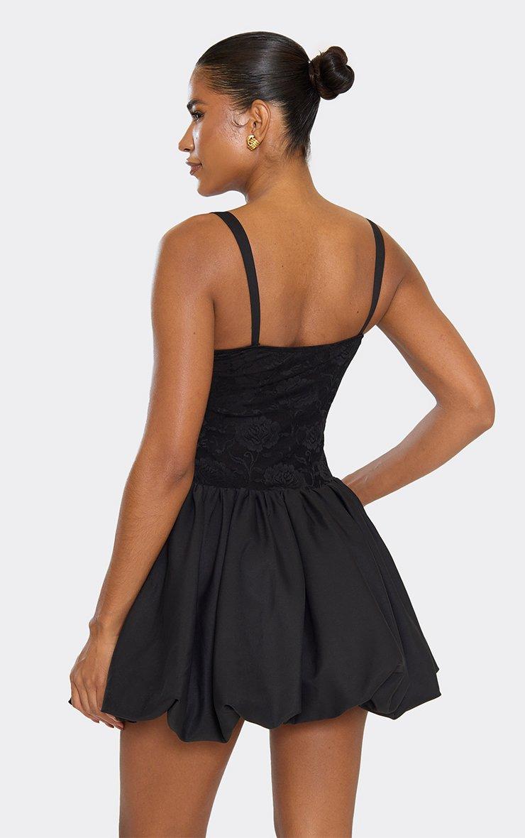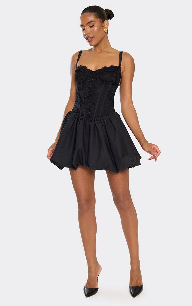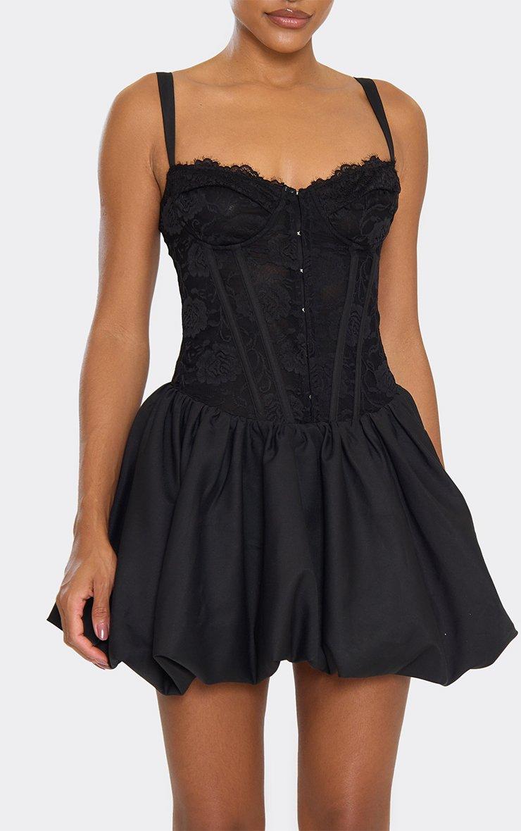 sweetheart neck underwire contrast lace puffball detail mini dress in black