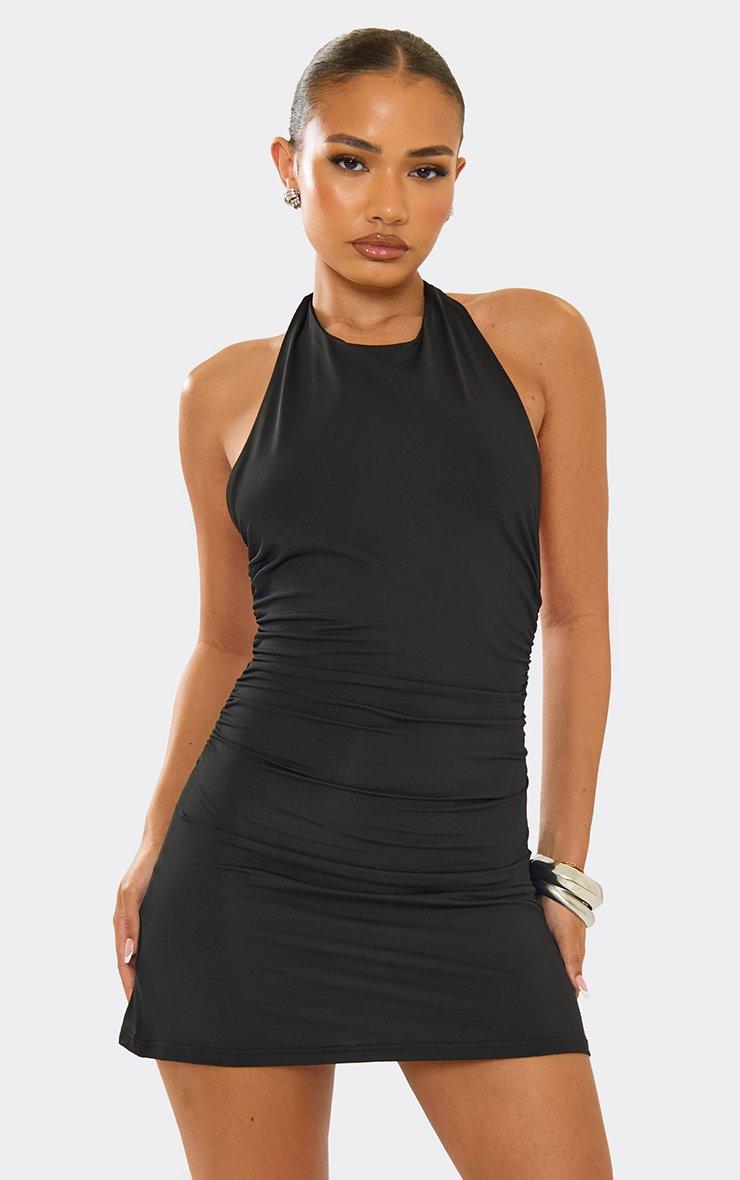 Halterneck Ruched Detail Fitted Mini Dress In Black