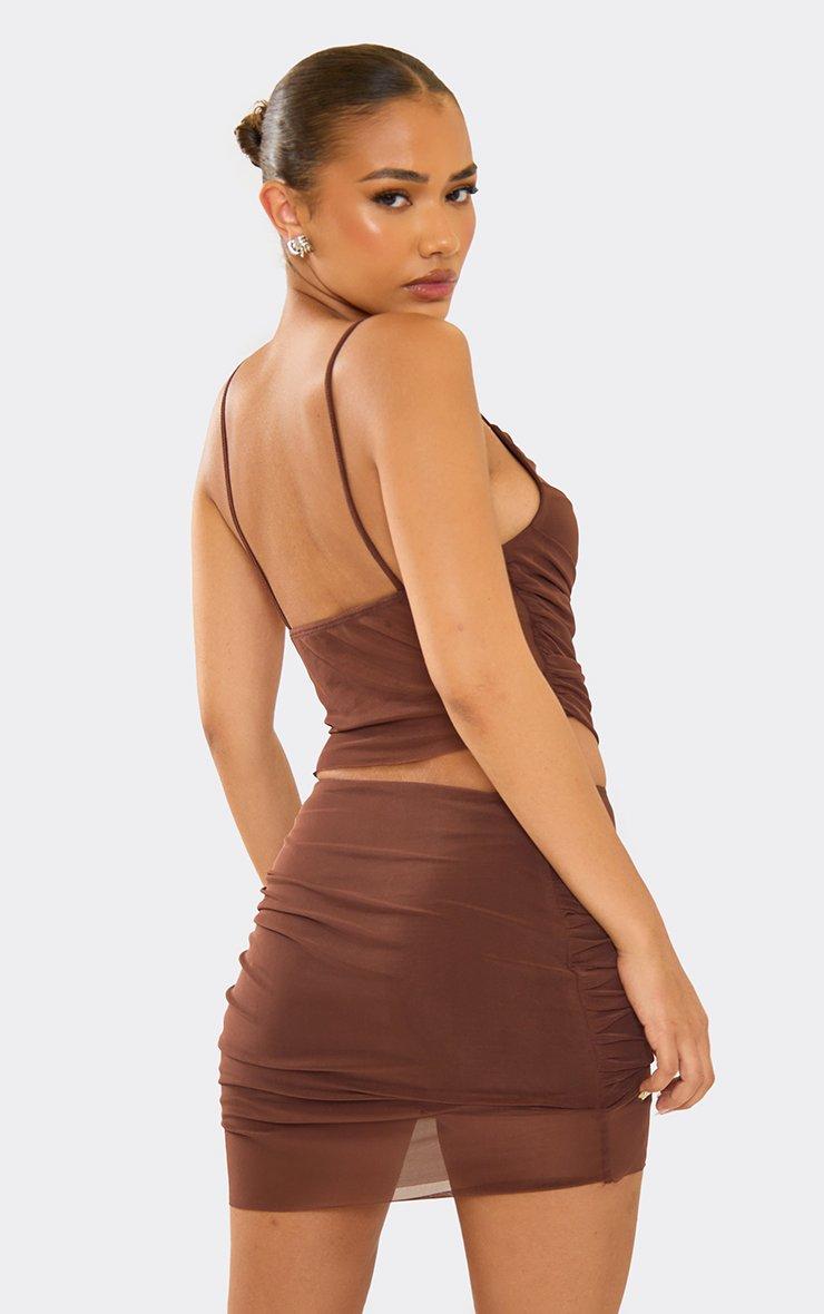 Square Neck Cut Out Ruched Detail Mini Dress In Chocolate Mesh