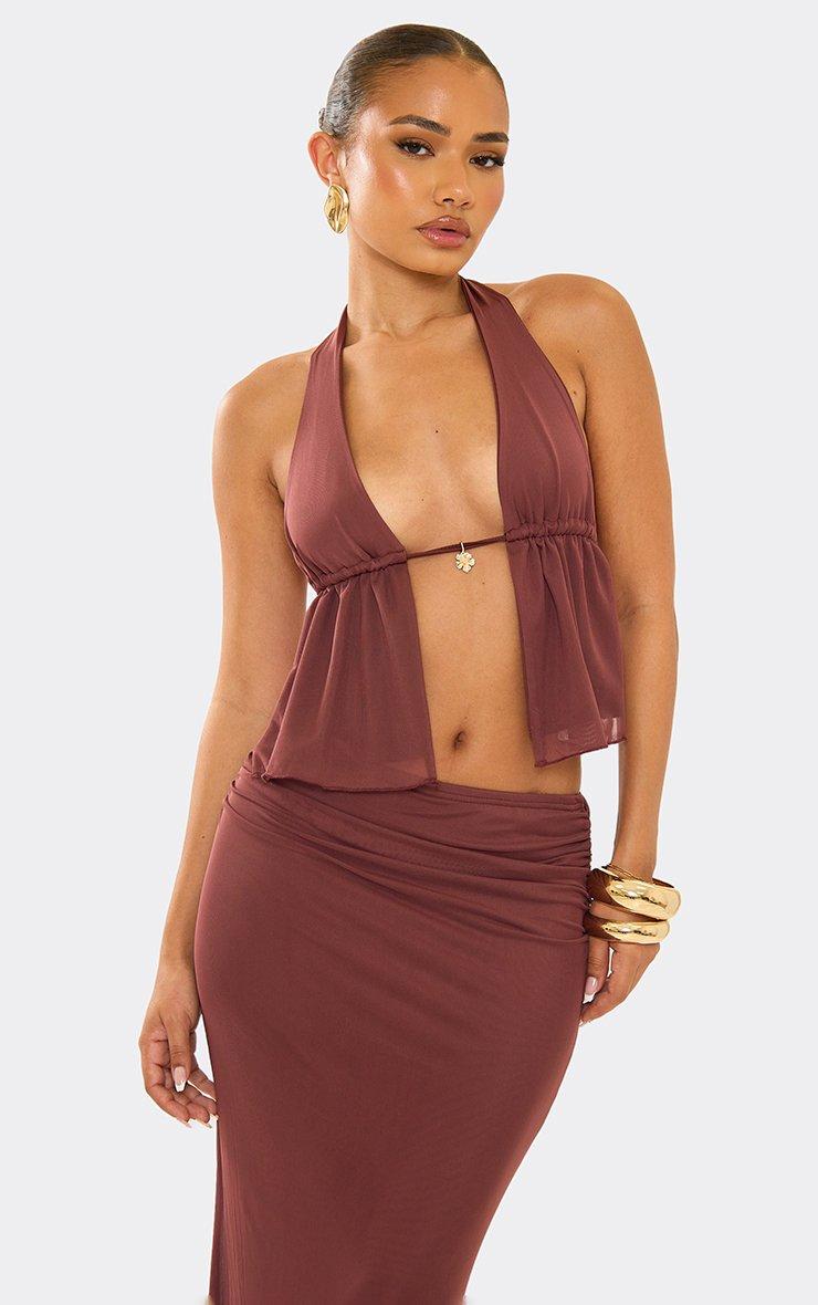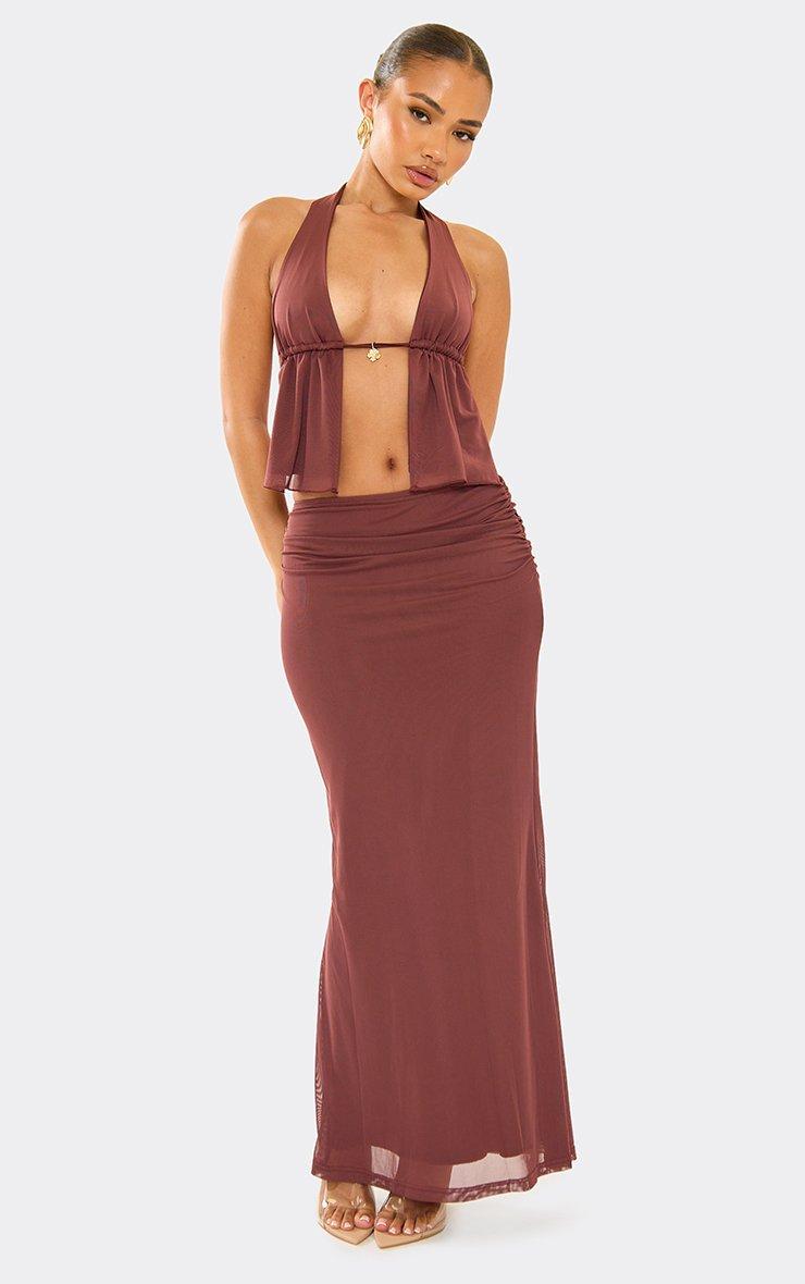 plunge halterneck split front top and ruched maxi skirt co-ord set in chocolate