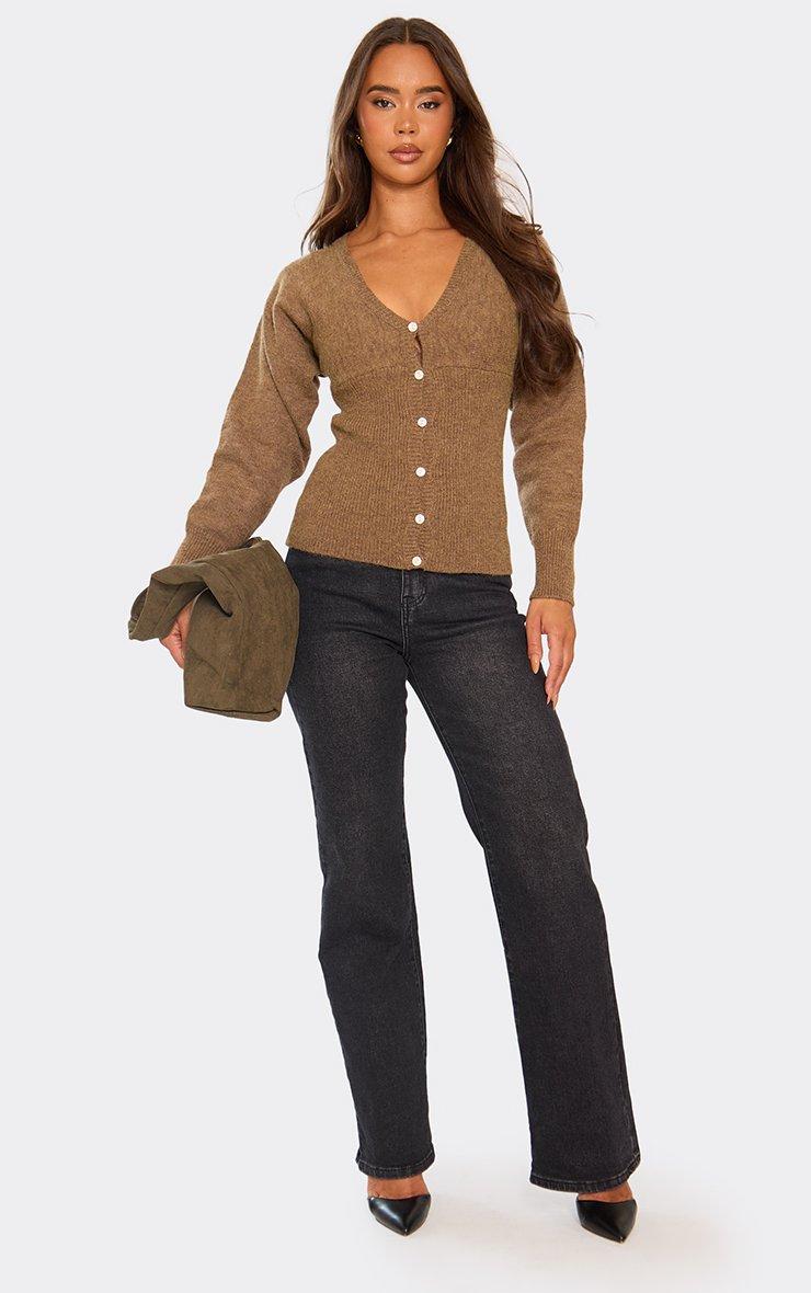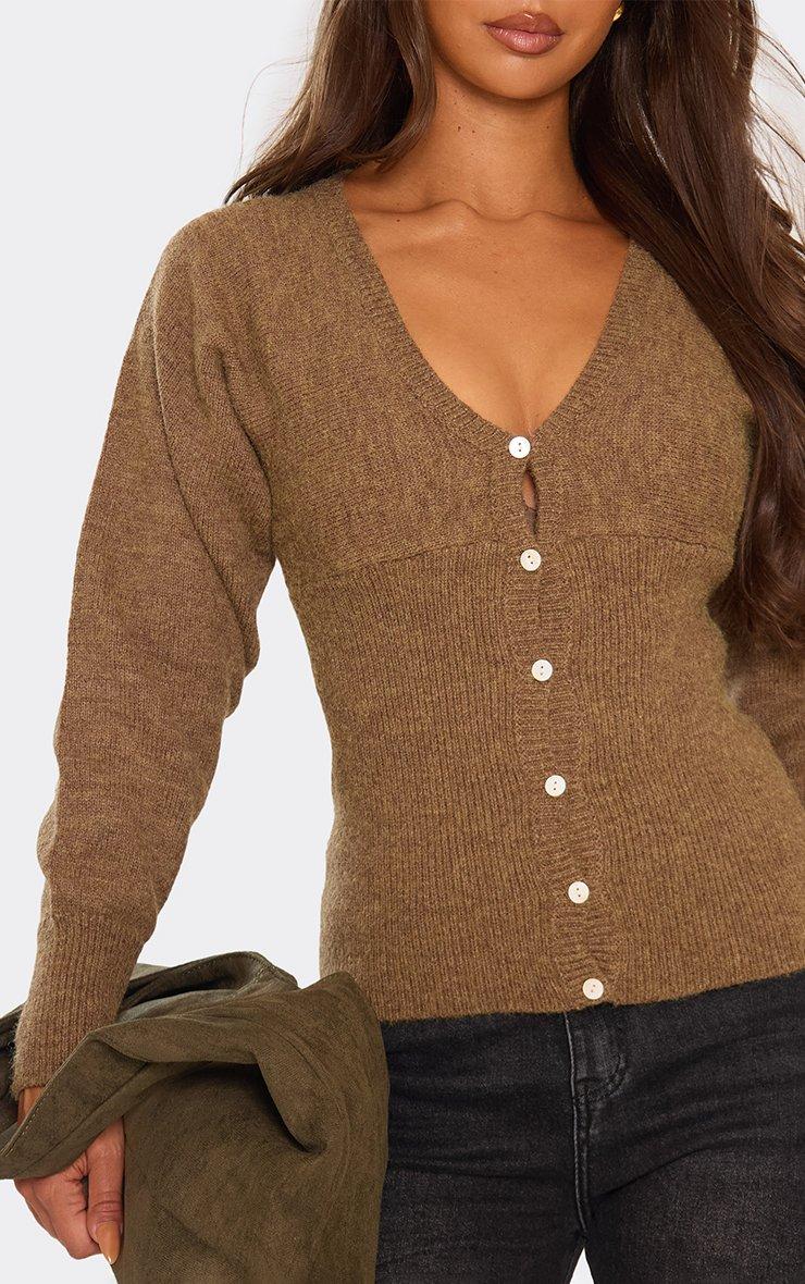 Long Sleeve Button Front Cinched Waist Cardigan In Brown Knit