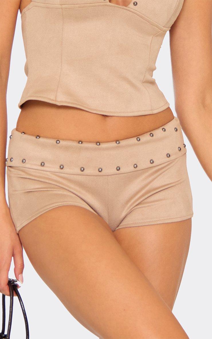 Low Rise Stud Detail Hot Pants In Stone Faux Suede
