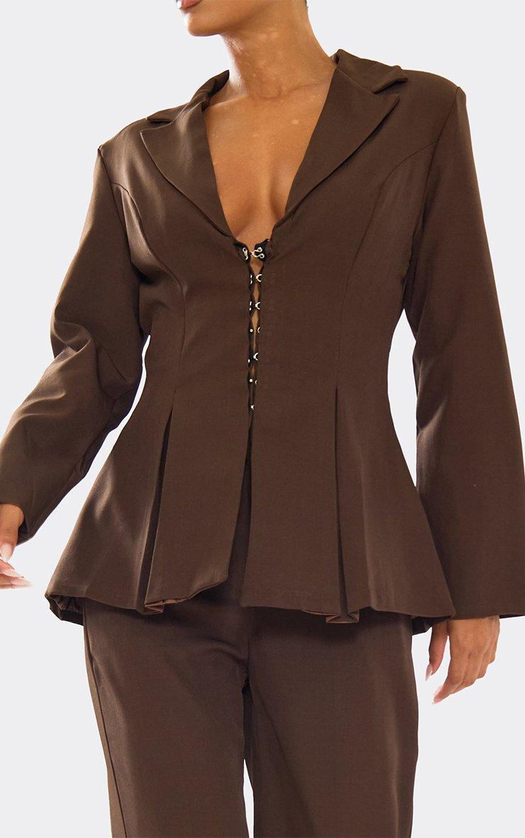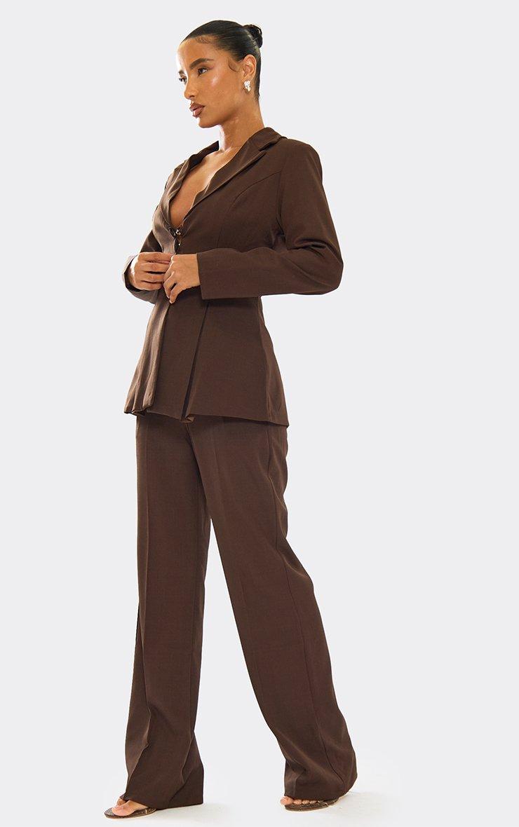 Popper Waist Pleated Wide Leg Tailored Trousers In Chocolate Brown