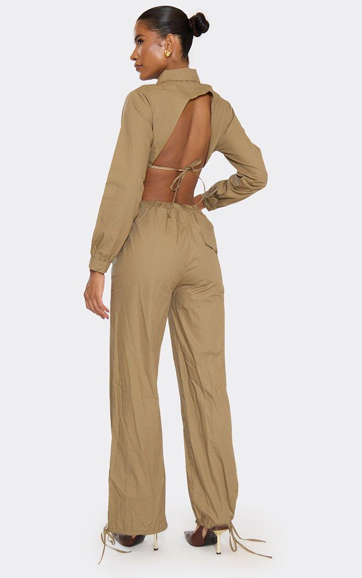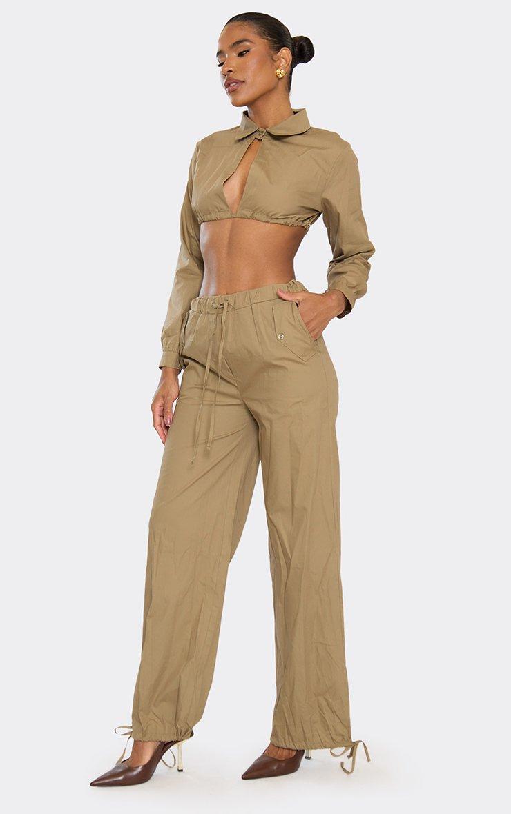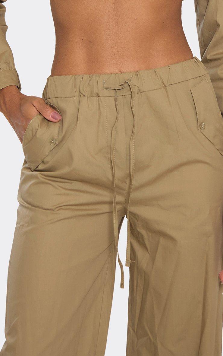 Drawstring Waist Straight Leg Trousers In Taupe Ribbed