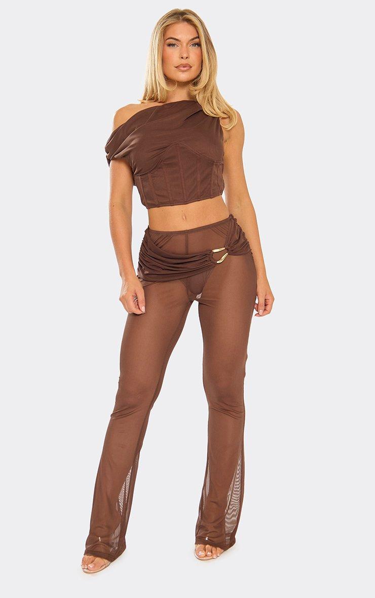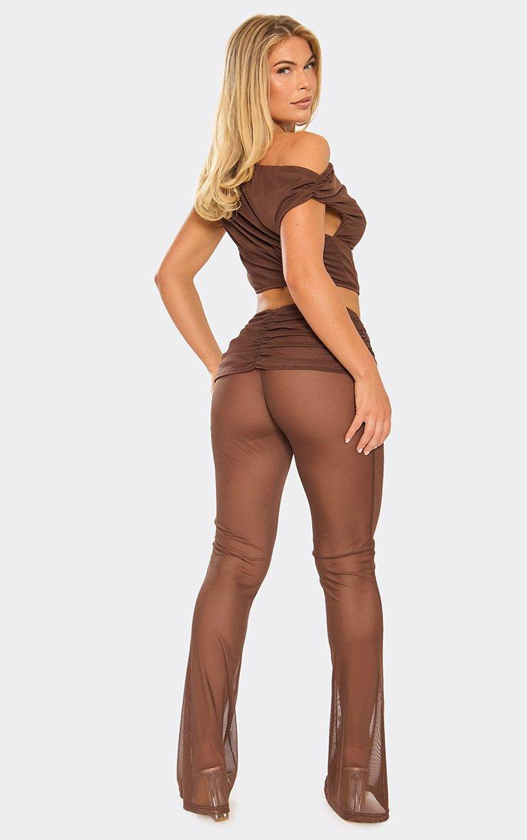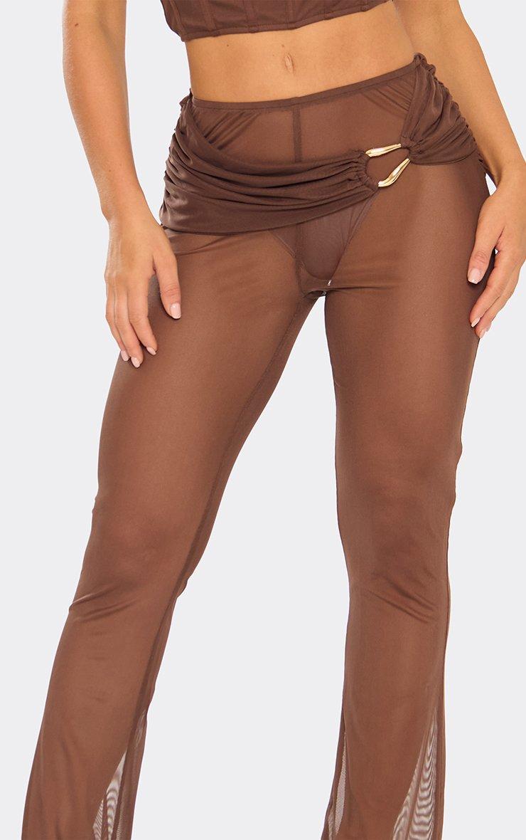 Low Rise Ruched Trim Detail Flared Trousers In Chocolate Brown Mesh