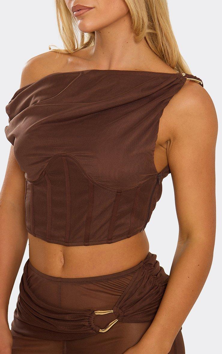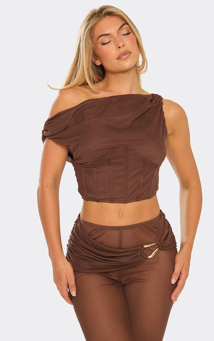 Off The Shoulder Corset Crop Top In Chocolate Brown