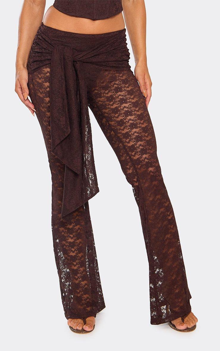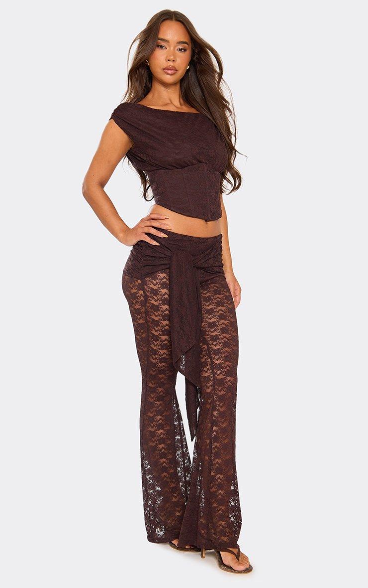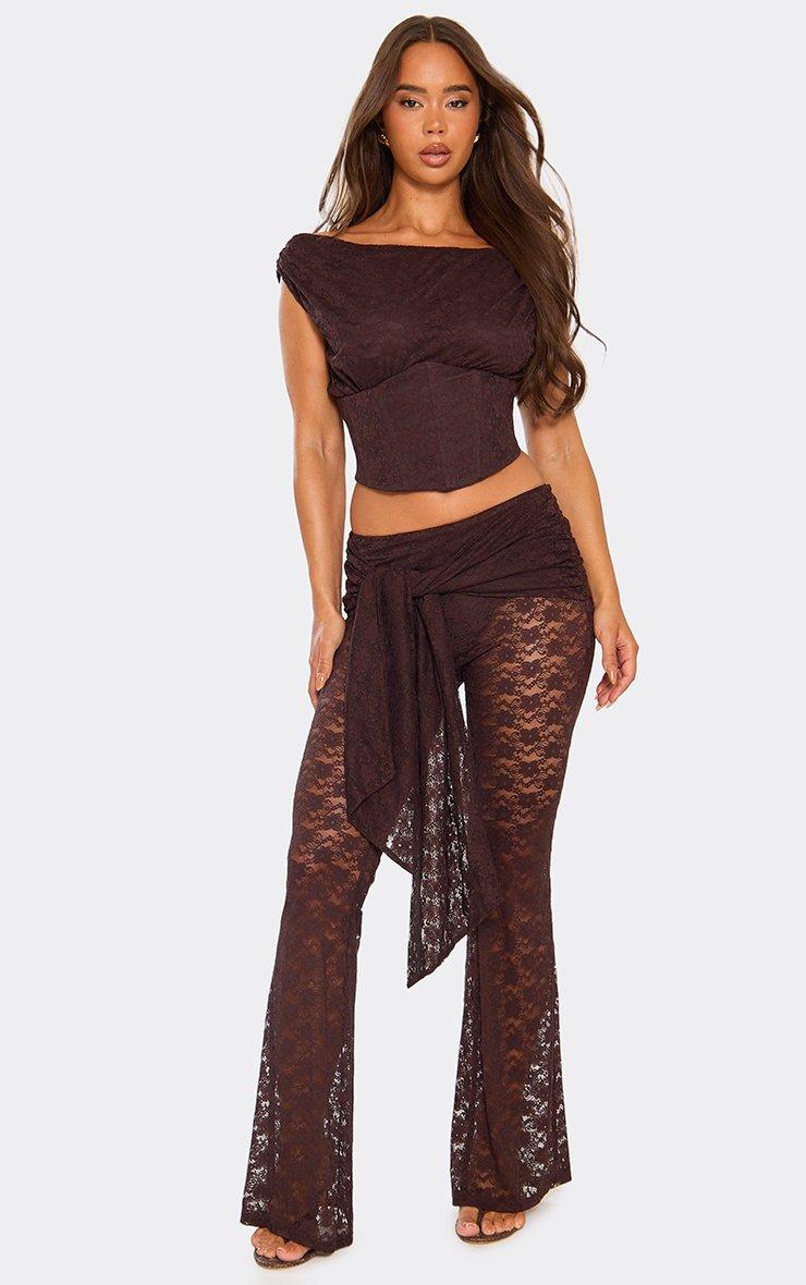 Tie Waist Detail Flared Leg Trousers In Chocolate Brown