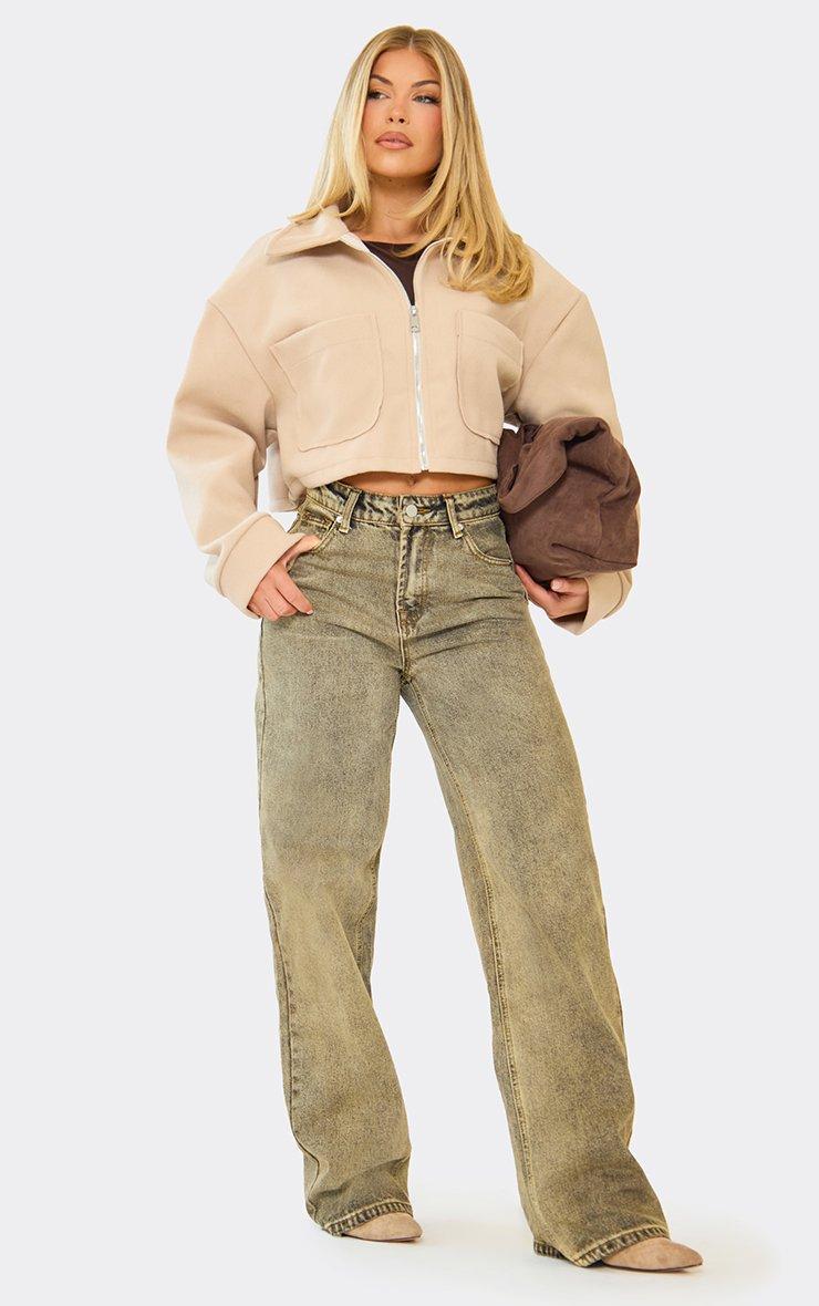 Long Sleeve Zip Up Detail Cropped Biker Jacket In Stone Wool