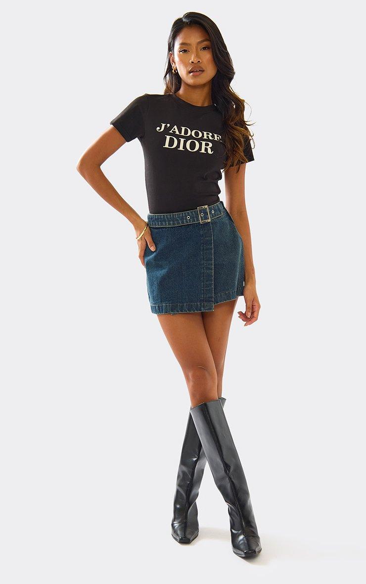 Mid Rise Wrap Belt Front Detail Mini Skirt In Mid Blue Denim