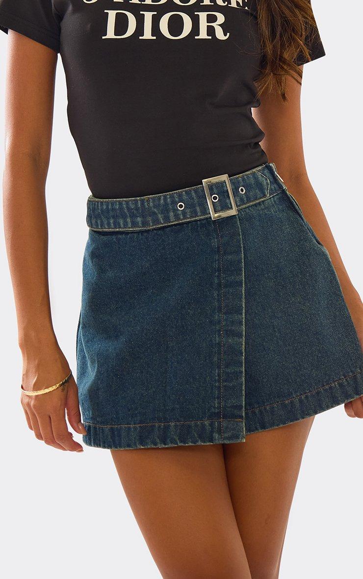 Wrap Front Buckle Detail Mini Skirt In Mid Blue Denim