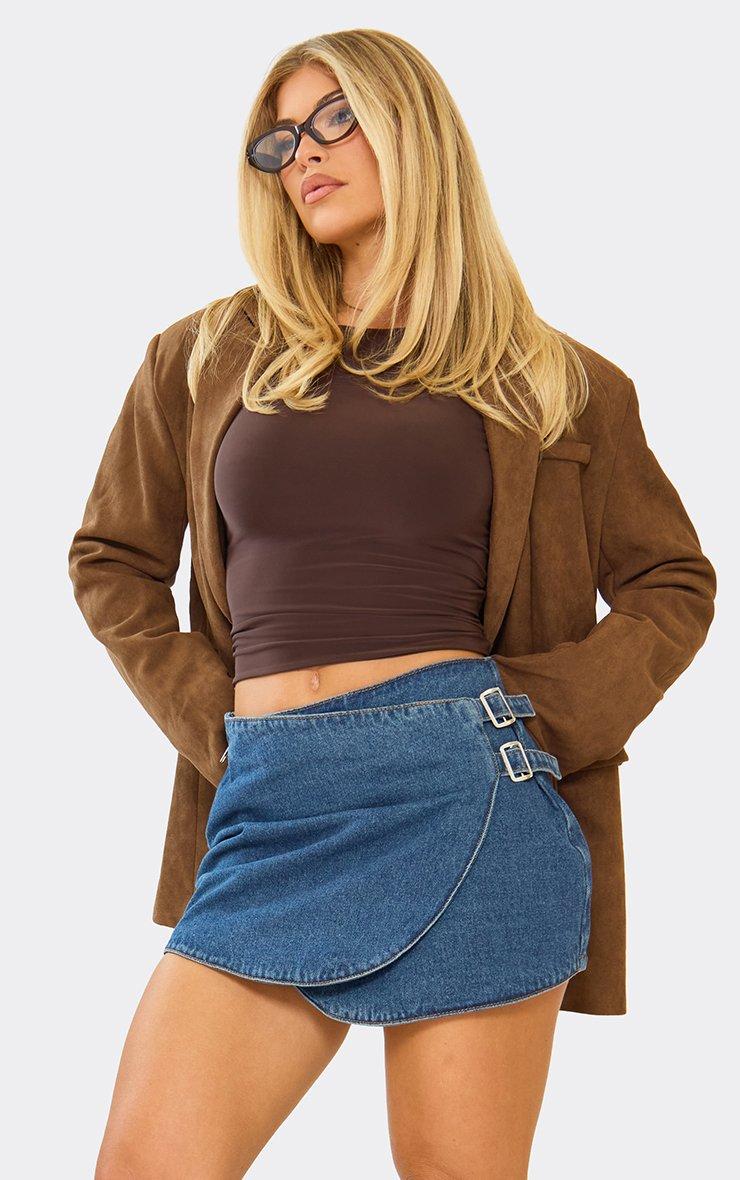 High Waist Seam Detail Wrap Over Skort In Blue Denim