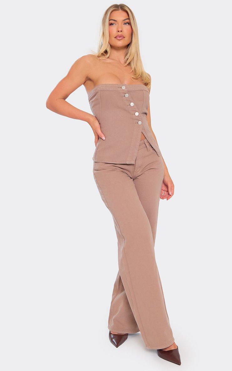 V Neck Button Down Seam Detail Crop Top In Brown Denim