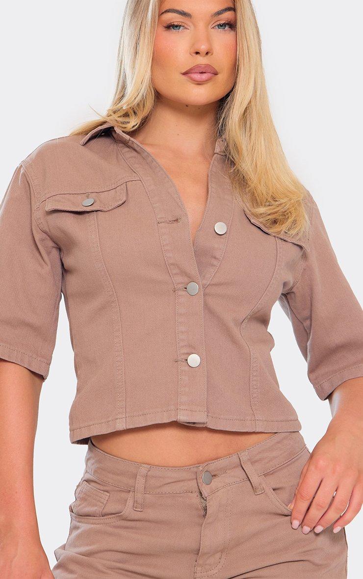 V Neck Button Down Seam Detail Crop Top In Brown Denim