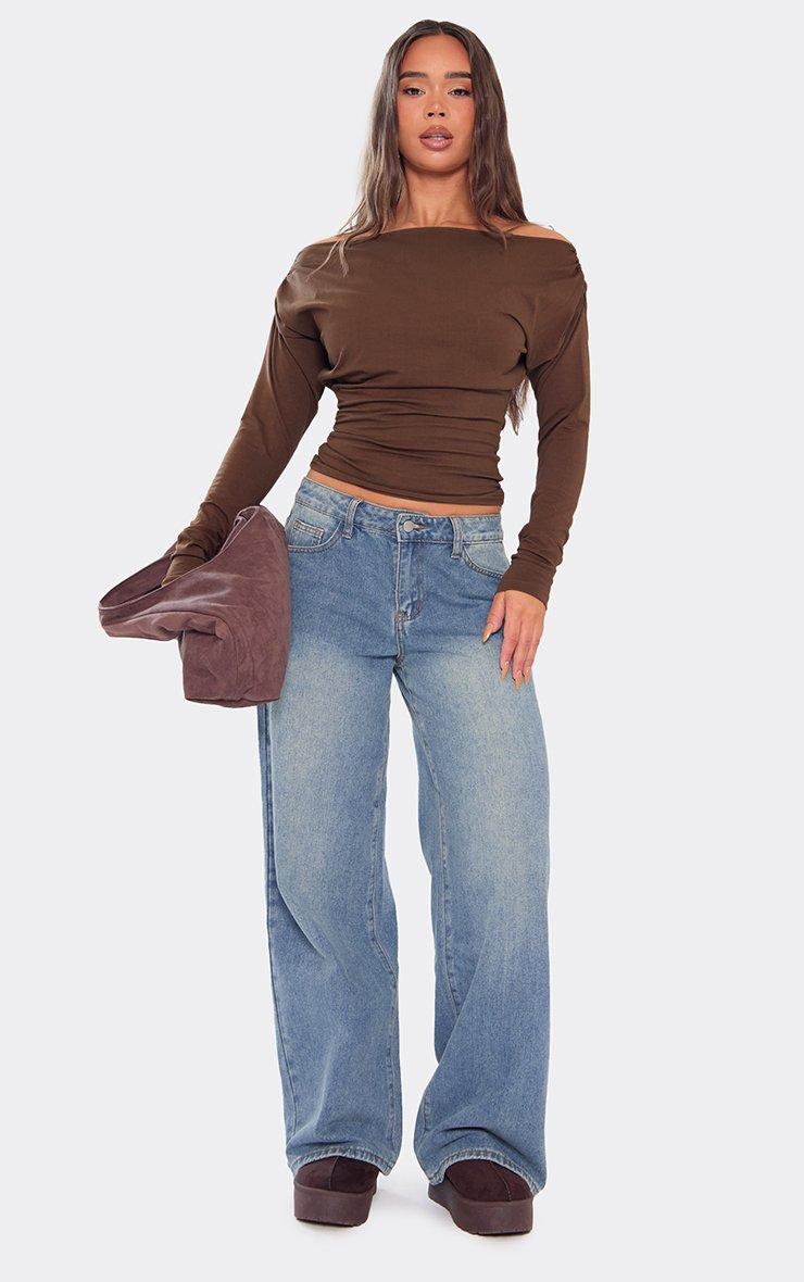 bardot long sleeve ruched cinched waist top in chocolate brown
