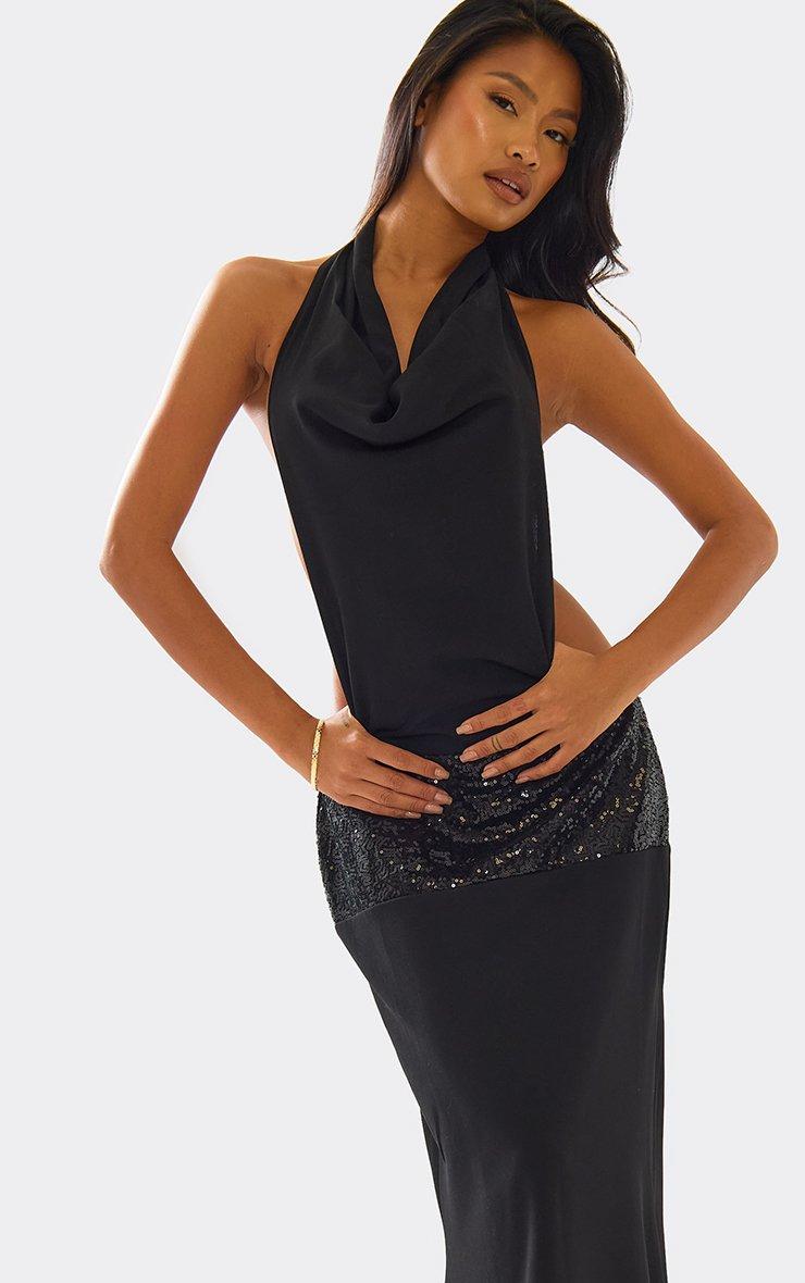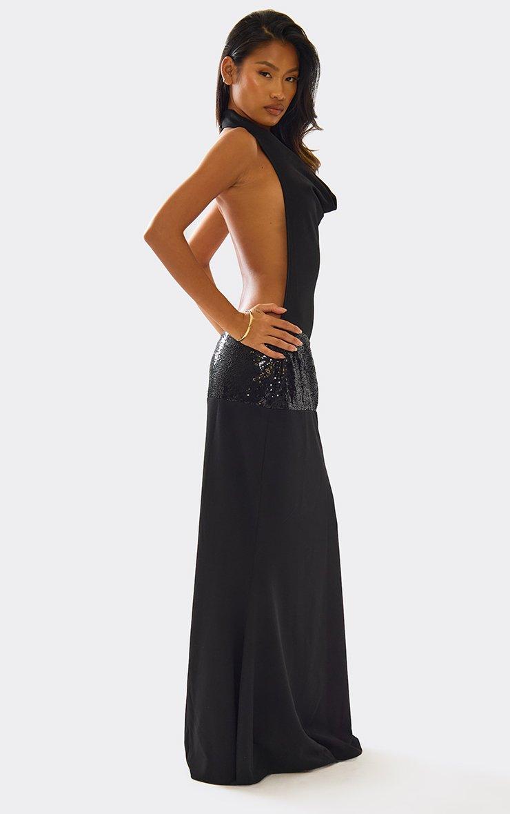 Cowl Neck Sequin Belt Detail Open Back Maxi Dress In Black