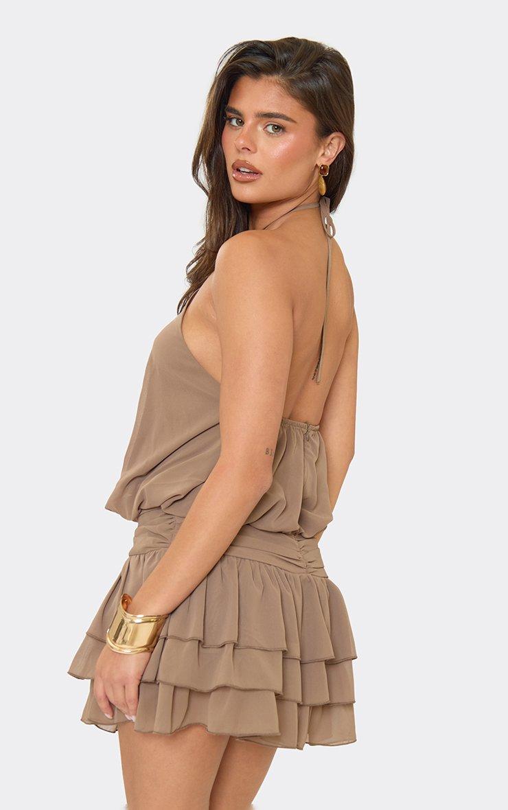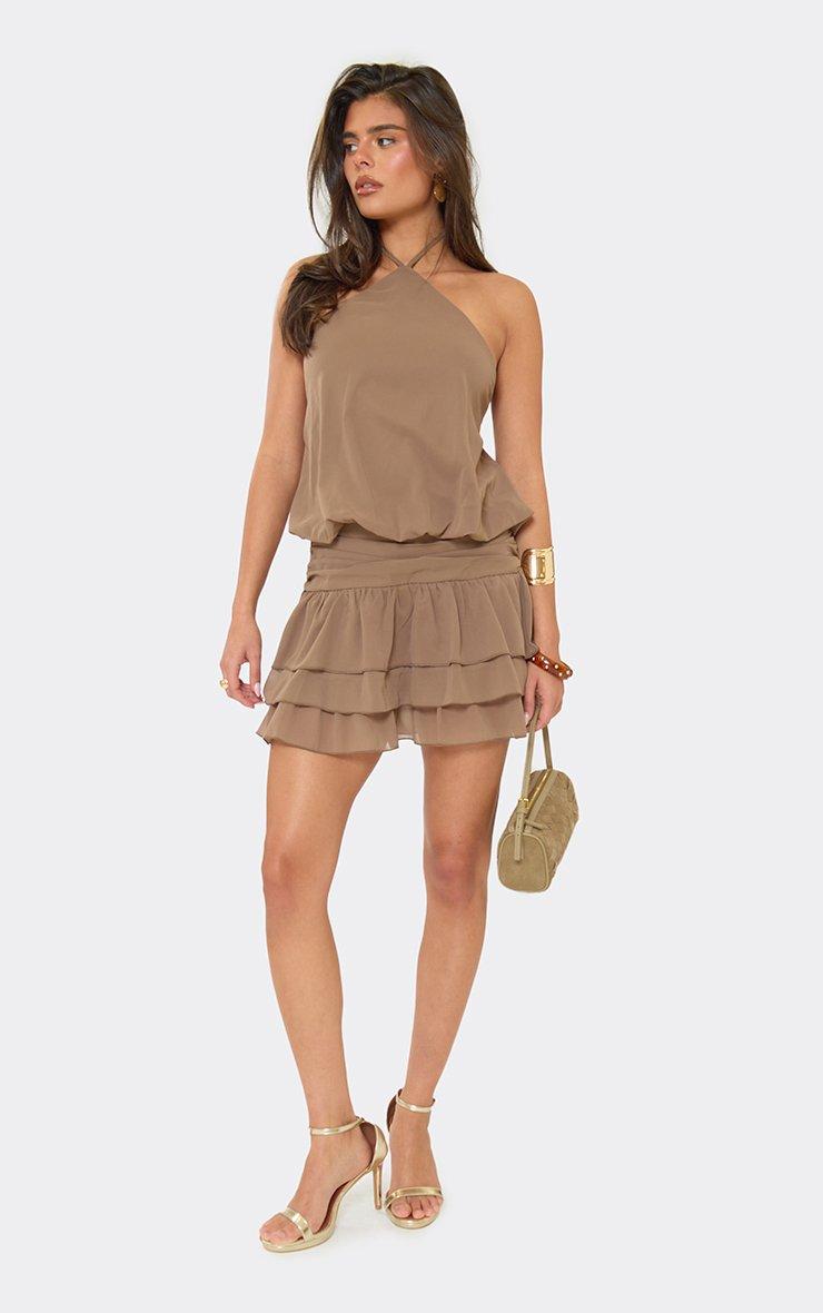 Halterneck Ruffle Skirt Detail Mini Dress In Mocha