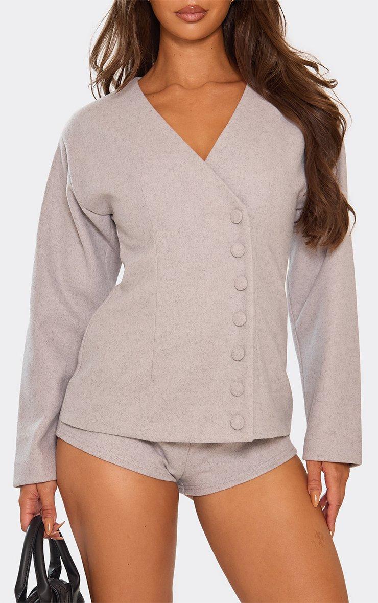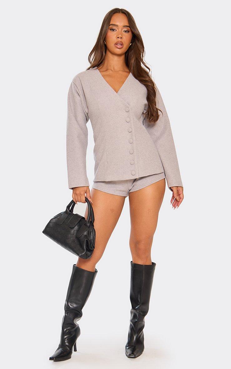 Long Sleeve Wool Look Asymmetric Blazer Playsuit In Grey