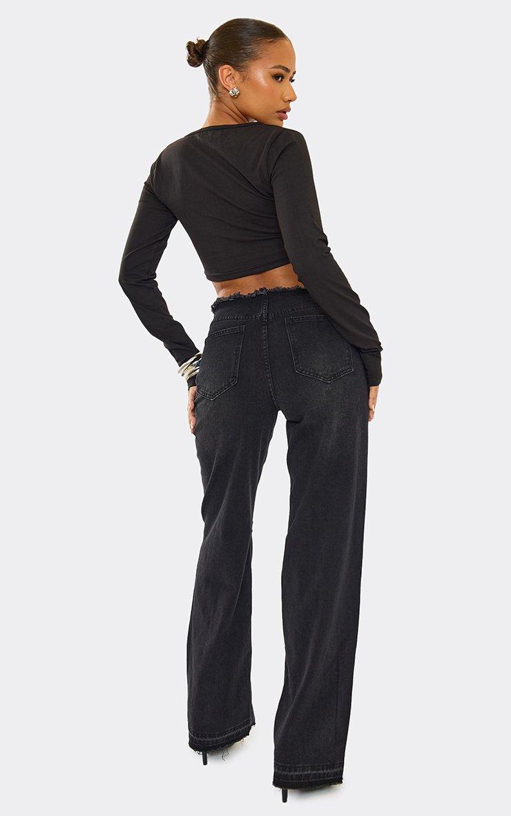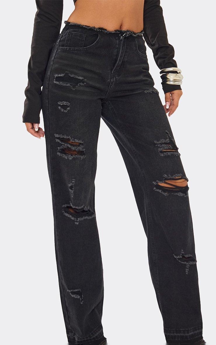 mid rise distressed detail wide leg jeans in black denim