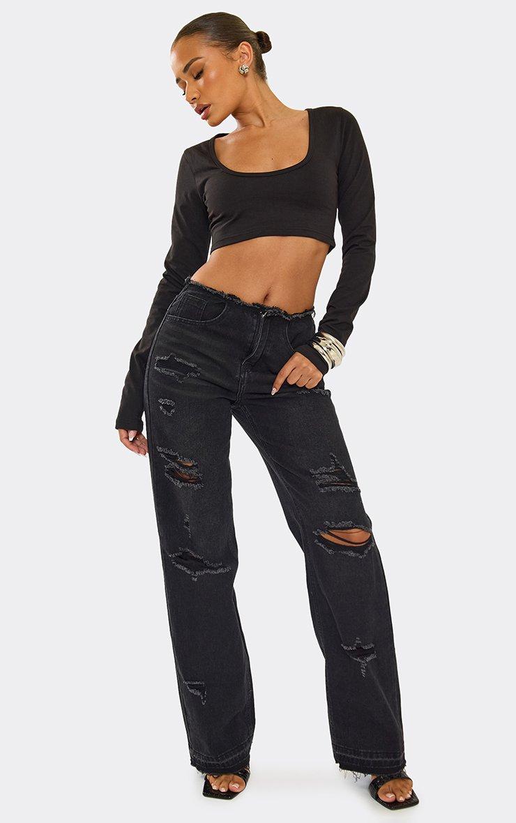 Mid Rise Distressed Detail Wide Leg Jeans In Black Denim