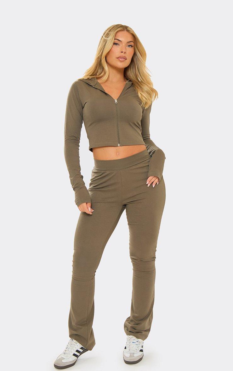 Contrast Drawstring Zip Up Cropped Hoodie In Khaki Green