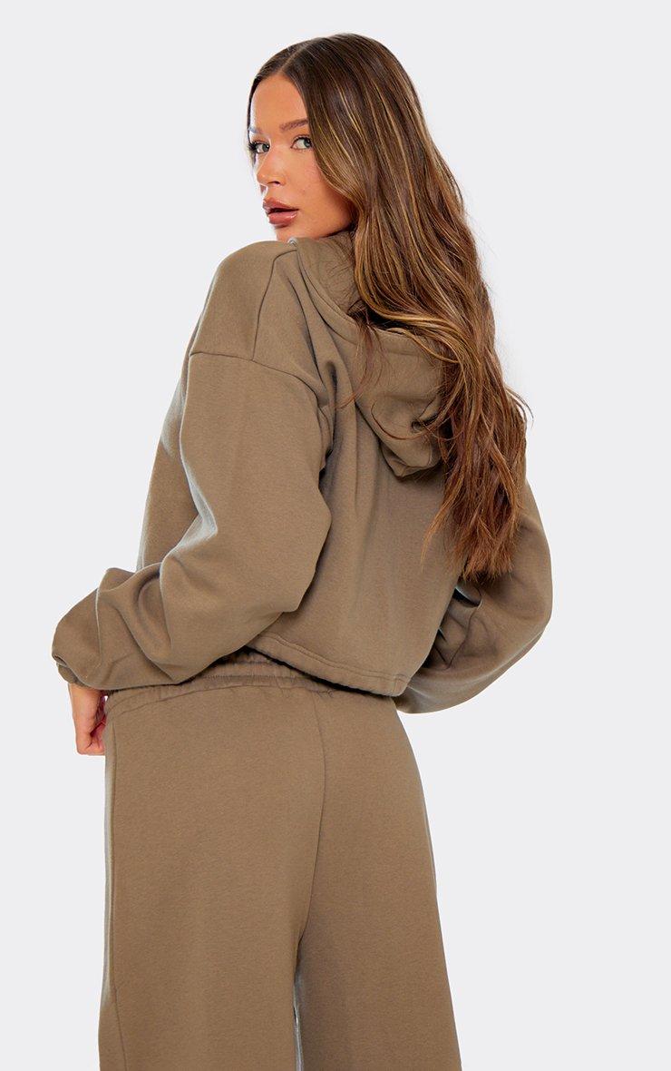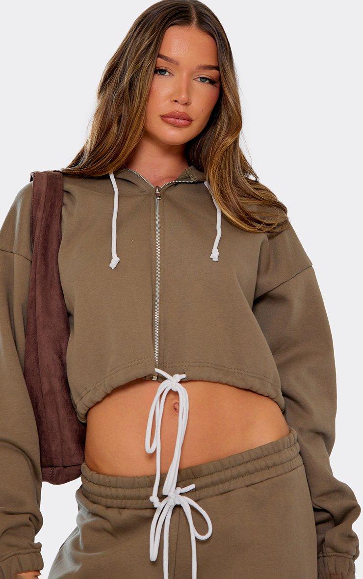 Long Sleeve Graphic Detail Zip Up Cropped Hoodie In Olive Green