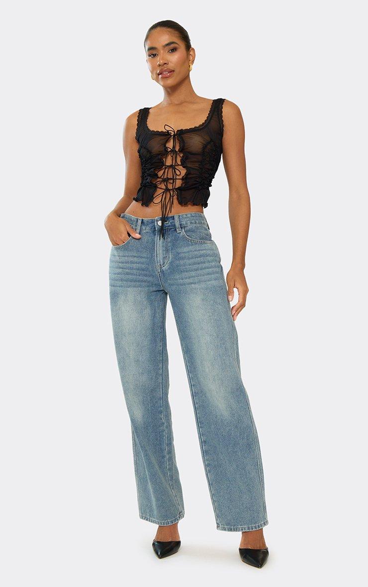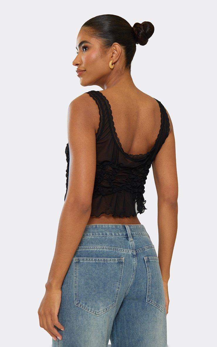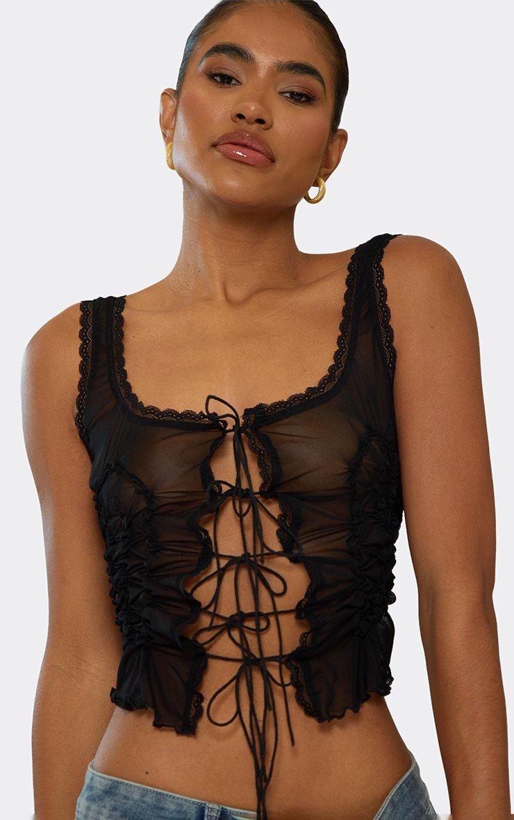 Strappy Square Neck Ruffle Tie Front Top In Black Mesh