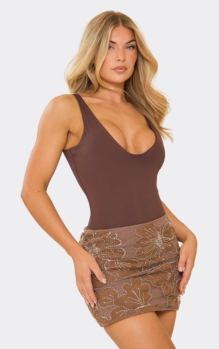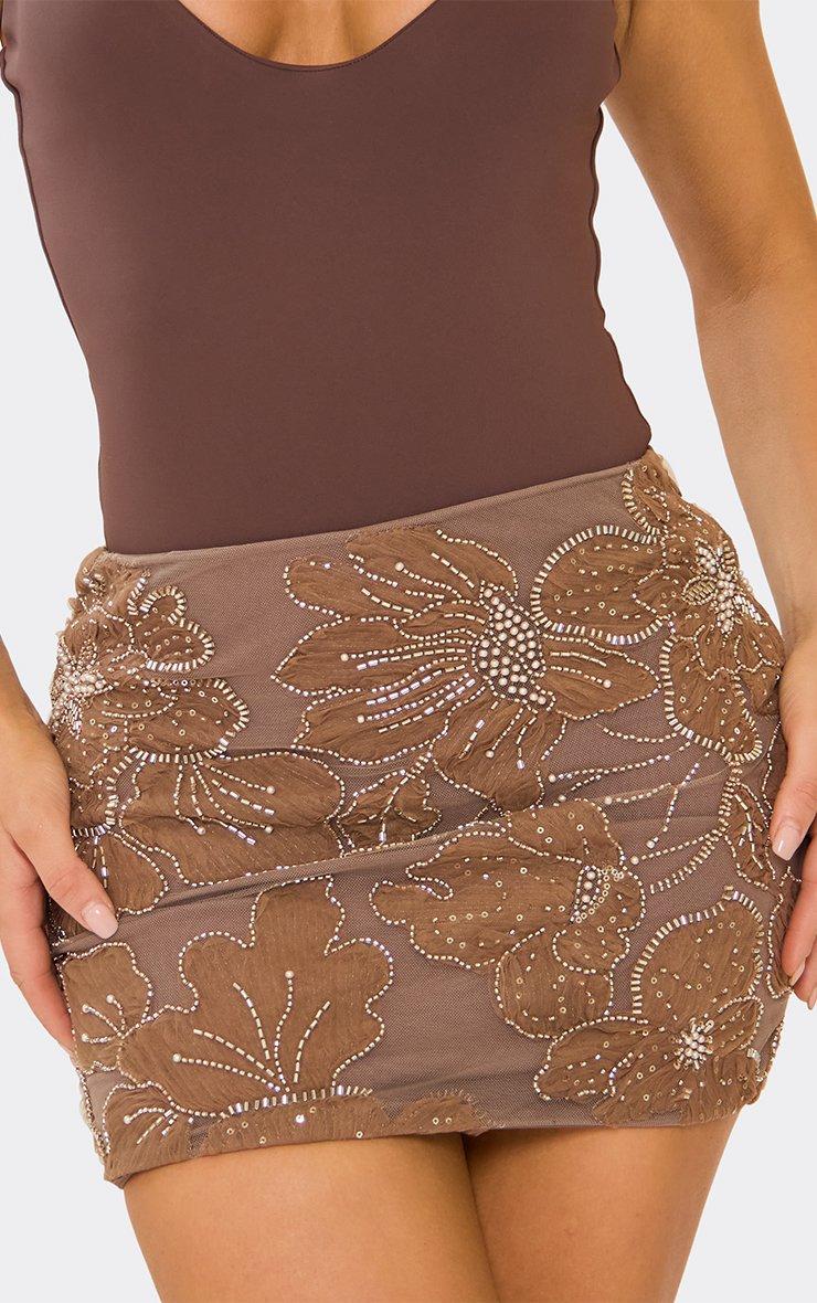 Mid Rise Embellished Floral Detail Mini Skirt In Taupe Sequin