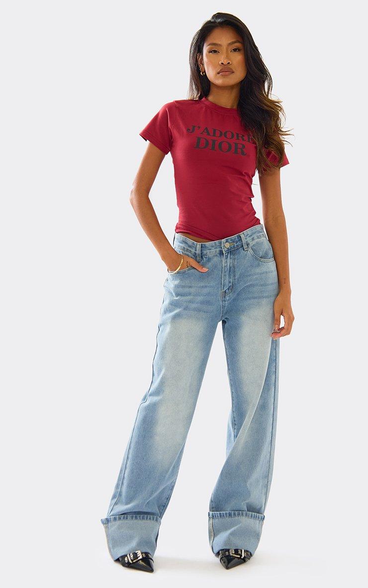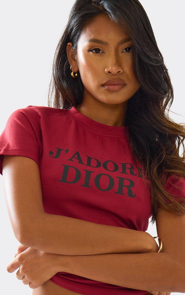 Short Sleeve Crew Neck Slogan Print Top In Red