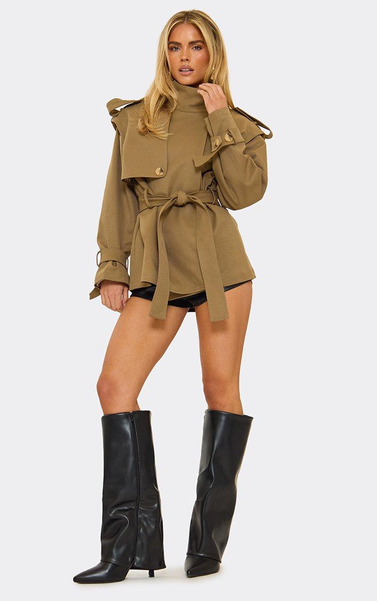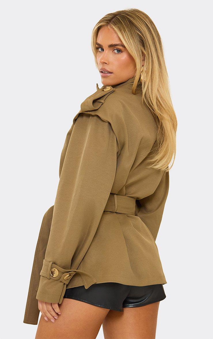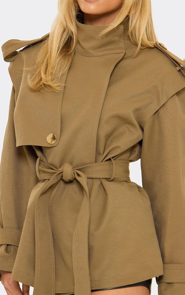 Long Sleeve Cinched Waist Cropped Wool Look Trench Jacket In Beige