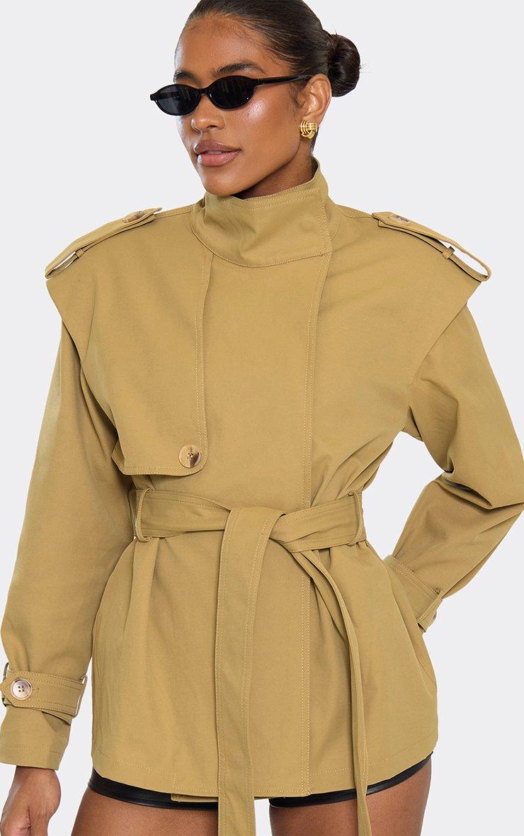 Long Sleeve Funnel Neck Trench Jacket In Chocolate Brown Faux Leather